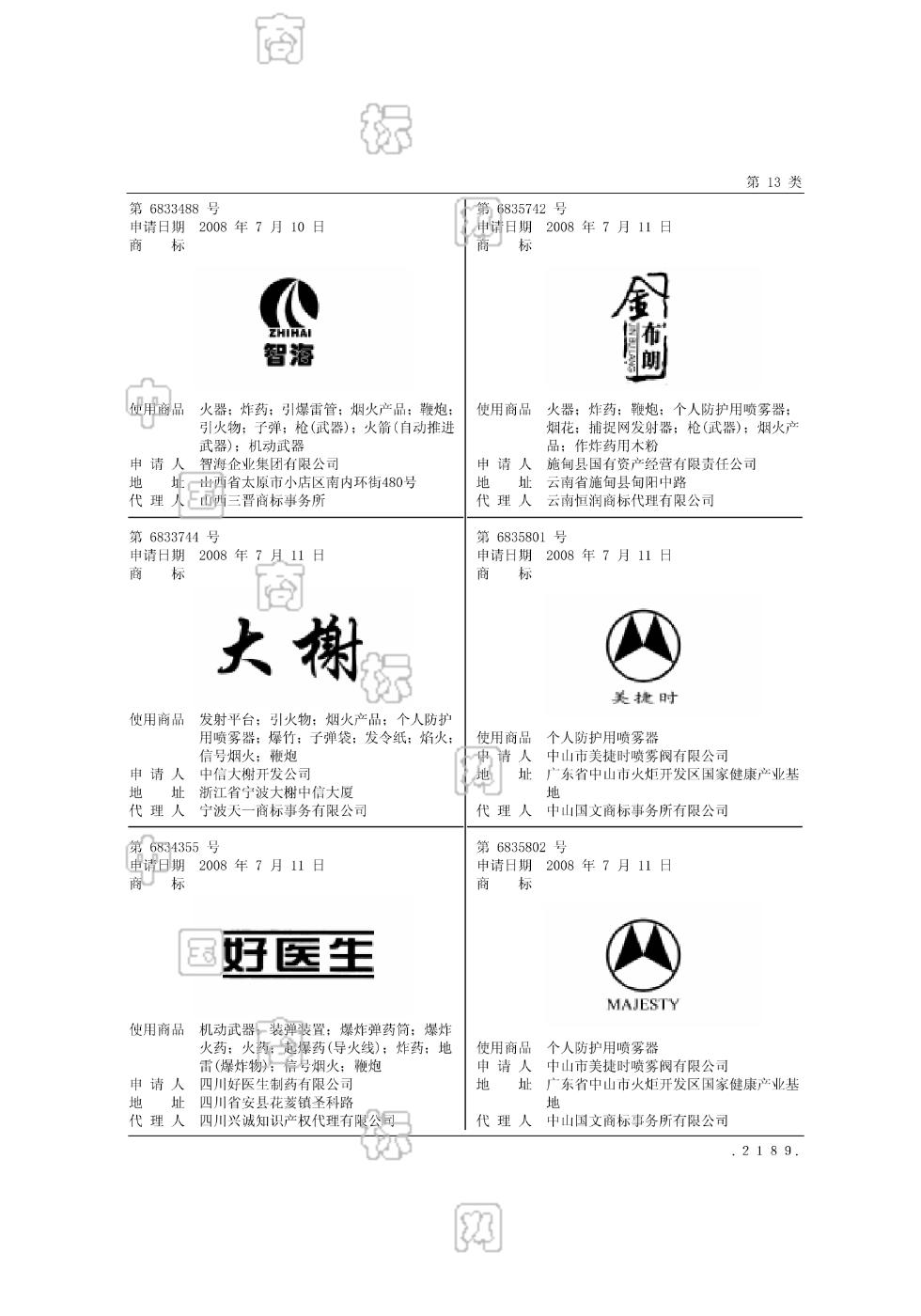 1301-捕捉网发射器;1301-枪(武器);1301-火器;1302-作炸药用木粉;1302-炸药;1303-烟火产品;1303-烟花;1303-鞭炮;1304-个人防护用喷雾器 - 1210