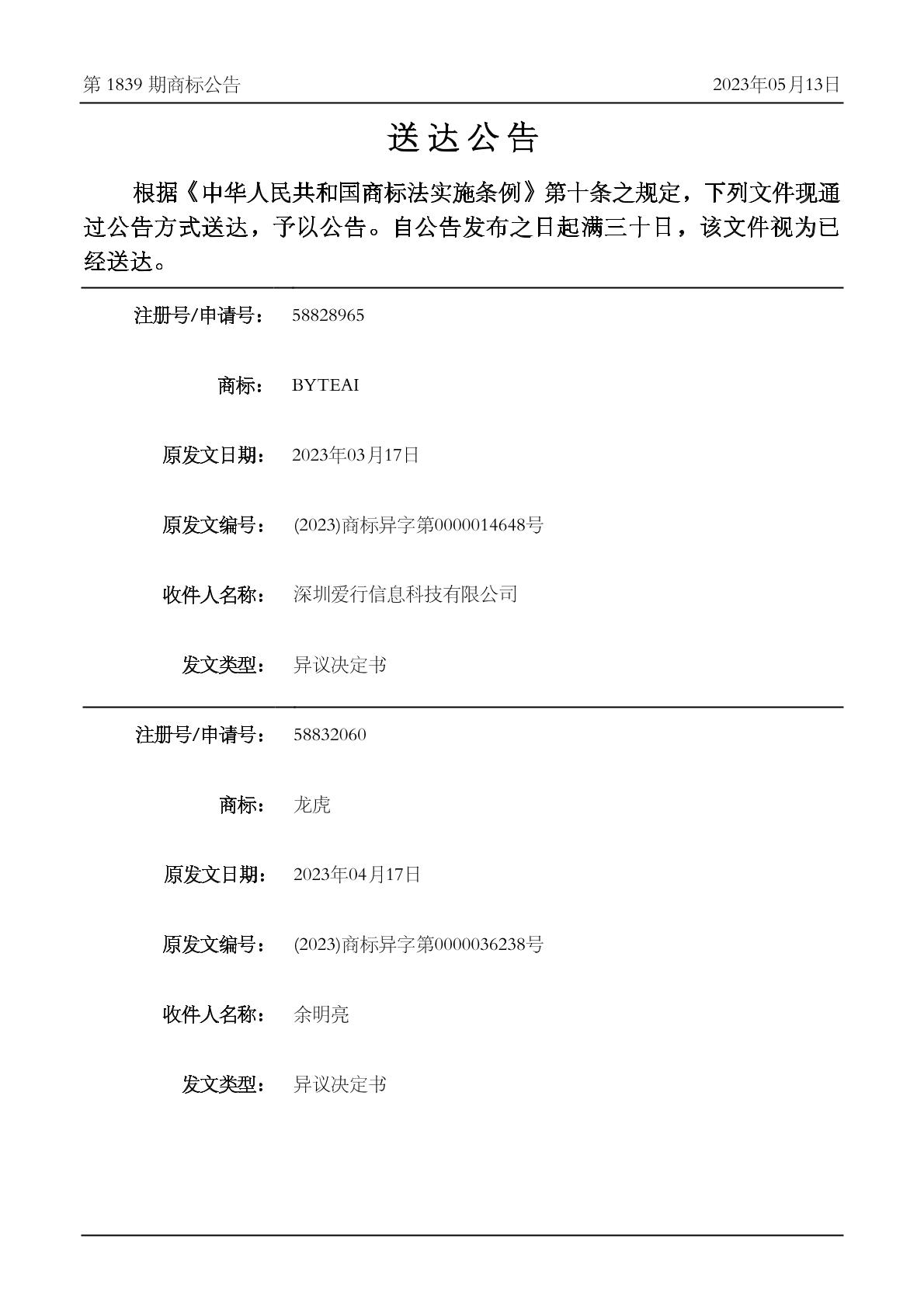 2023-05-15 商标异议申请 | 排版送达公告(异议决定书)