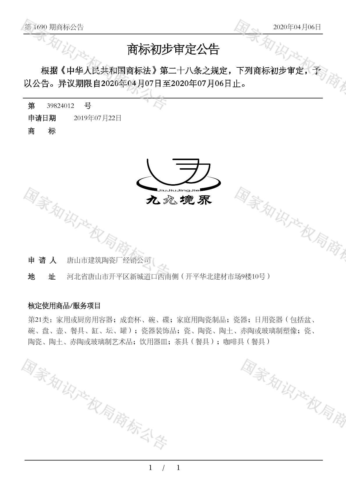 2101-家用或厨房用容器;2101-成套杯、碗、碟;2103-家庭用陶瓷制品;2103-日用瓷器(包括盆、碗、盘、壶、餐具、缸、坛、罐);2103-瓷器;2104-瓷、陶瓷、陶土、赤陶或玻璃制塑像;2104-瓷、陶瓷、陶土、赤陶或玻璃制艺术品;2104-瓷器装饰品;2105-咖啡具(餐具);2105-茶具(餐具);2105-饮用器皿 - 1690