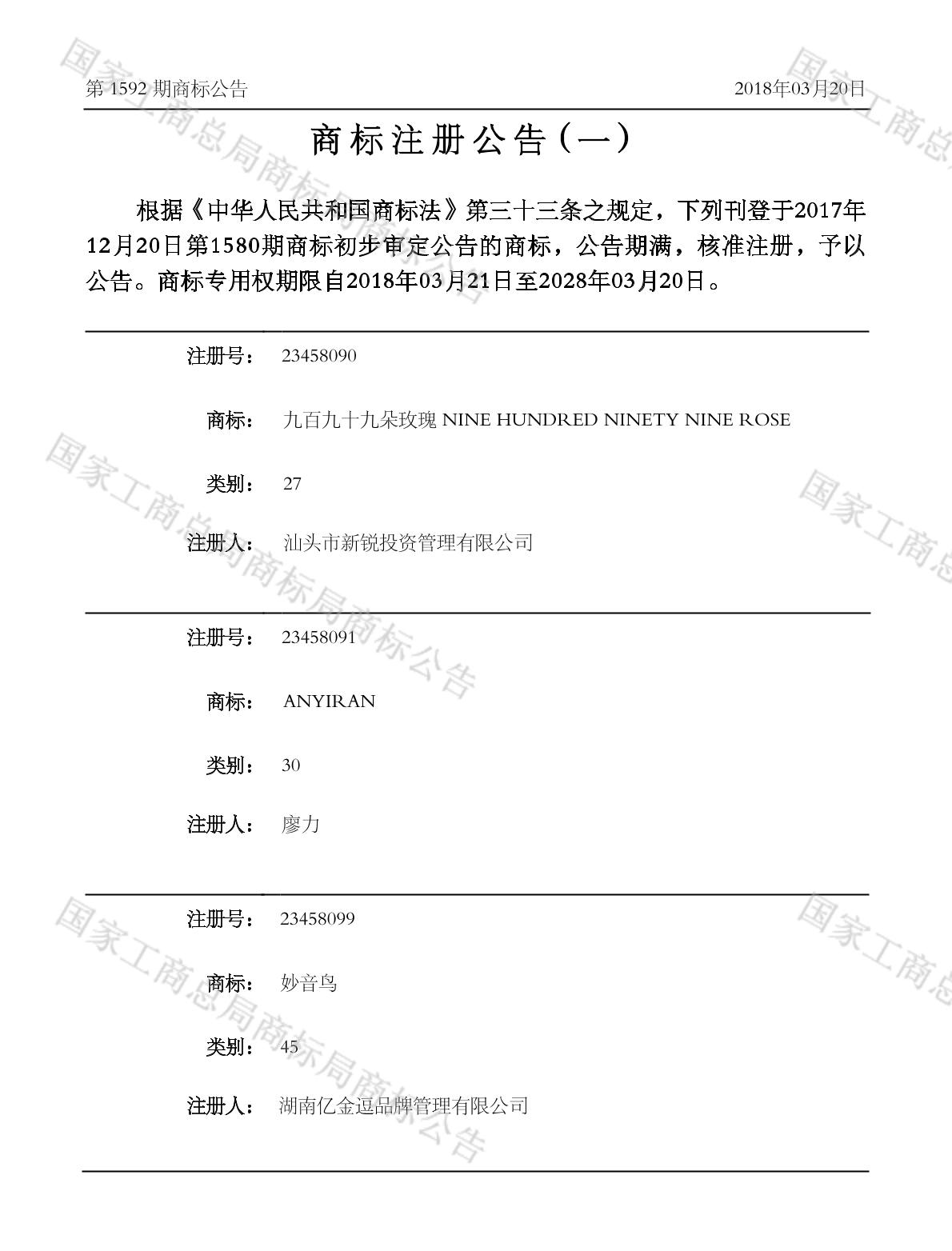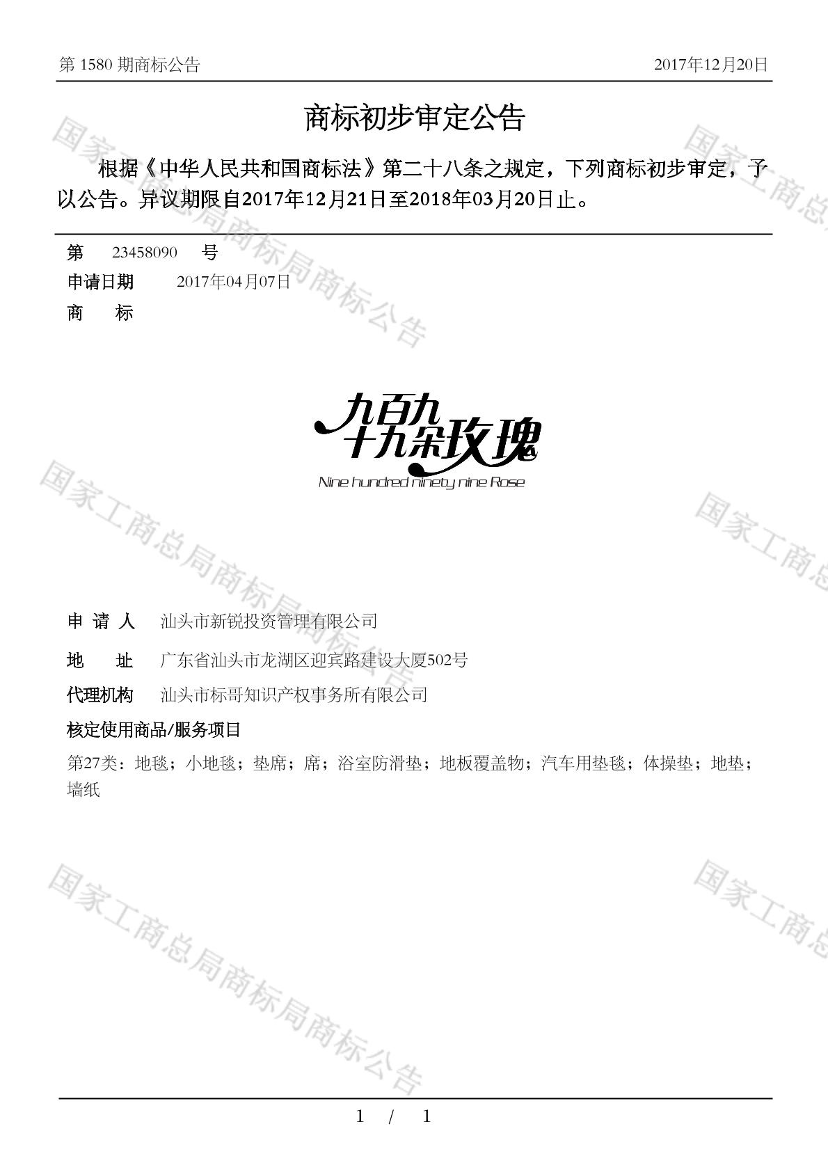 【九百九十九朵玫瑰 NINE HUNDRED NINETY NINE ROSE】商标详情