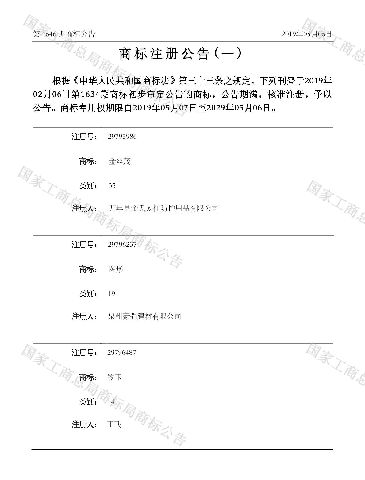 1901-木地板;1902-大理石;1902-石板;1906-建筑用马赛克;1906-瓷砖;1906-砖;1909-非金属板条;1909-非金属门;1911-建筑玻璃;1913-制砖用粘合料 - 1634