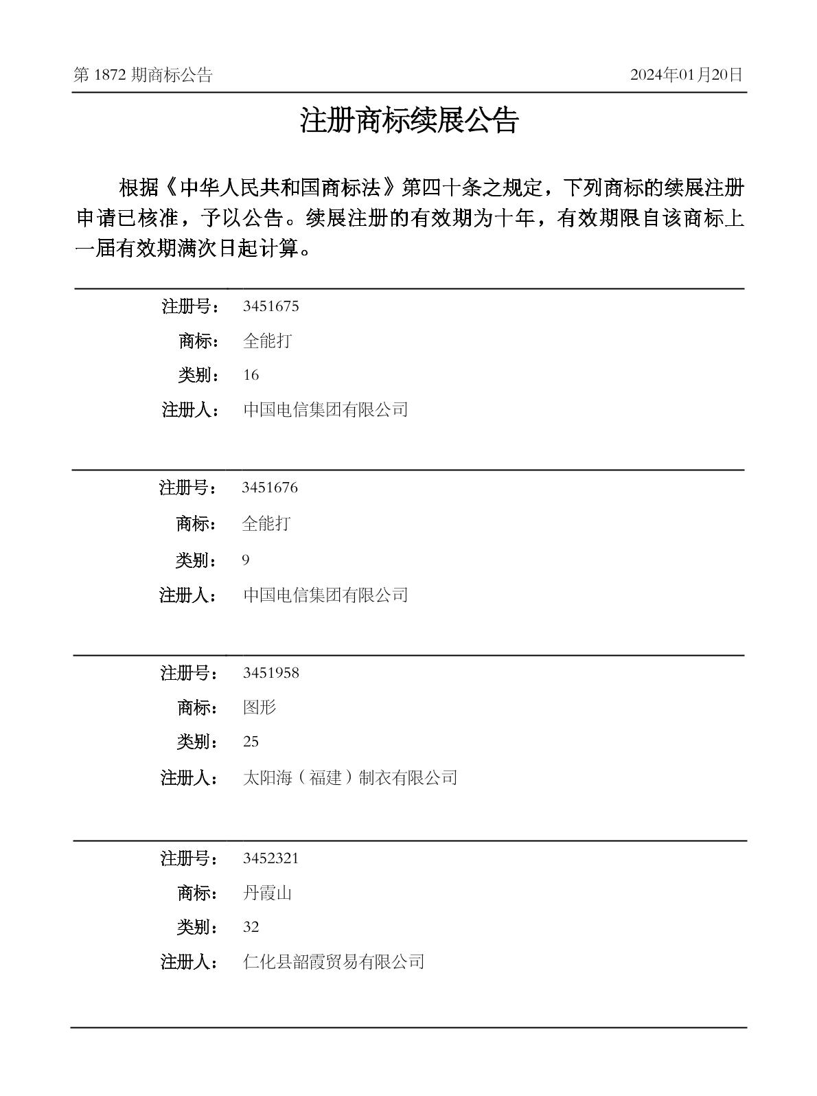 注册商标续展公告 2024-01-20 第1872期 查看公告