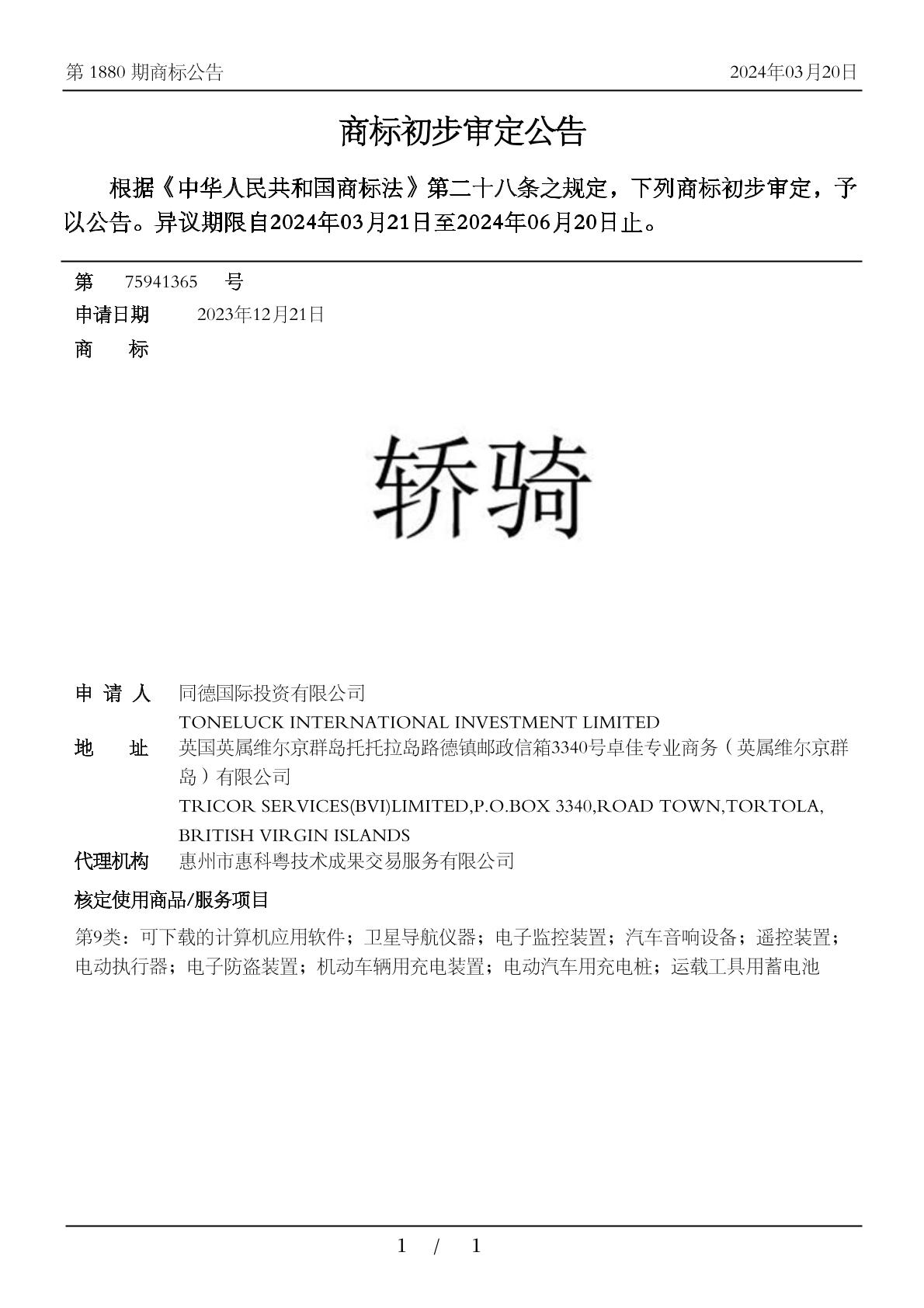 0901-可下载的计算机应用软件;0907-卫星导航仪器;0908-汽车音响设备;0908-电子监控装置;0913-电动执行器;0913-遥控装置;0920-电子防盗装置;0922-机动车辆用充电装置;0922-电动汽车用充电桩;0922-运载工具用蓄电池 - 1880