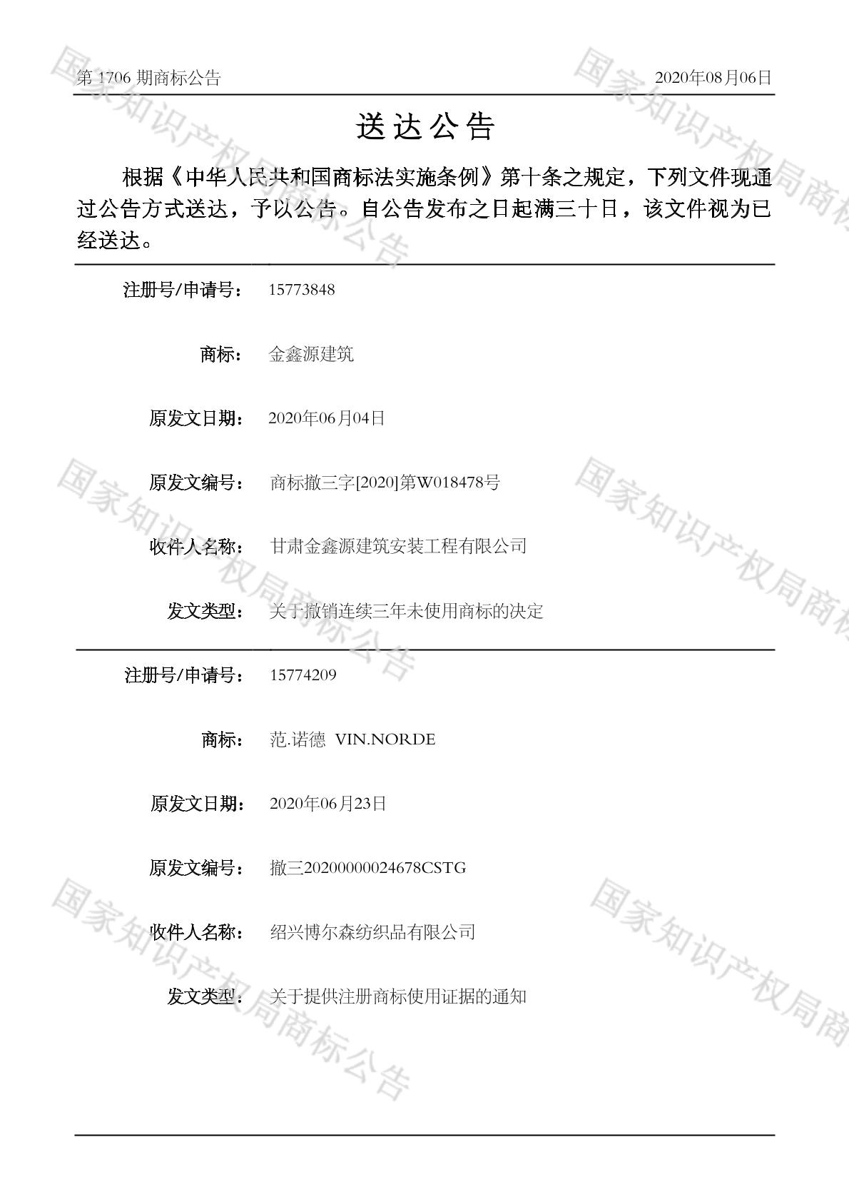 2020-06-09 撤销连续三年停止使用注册商标 | 撤销商标通知发文