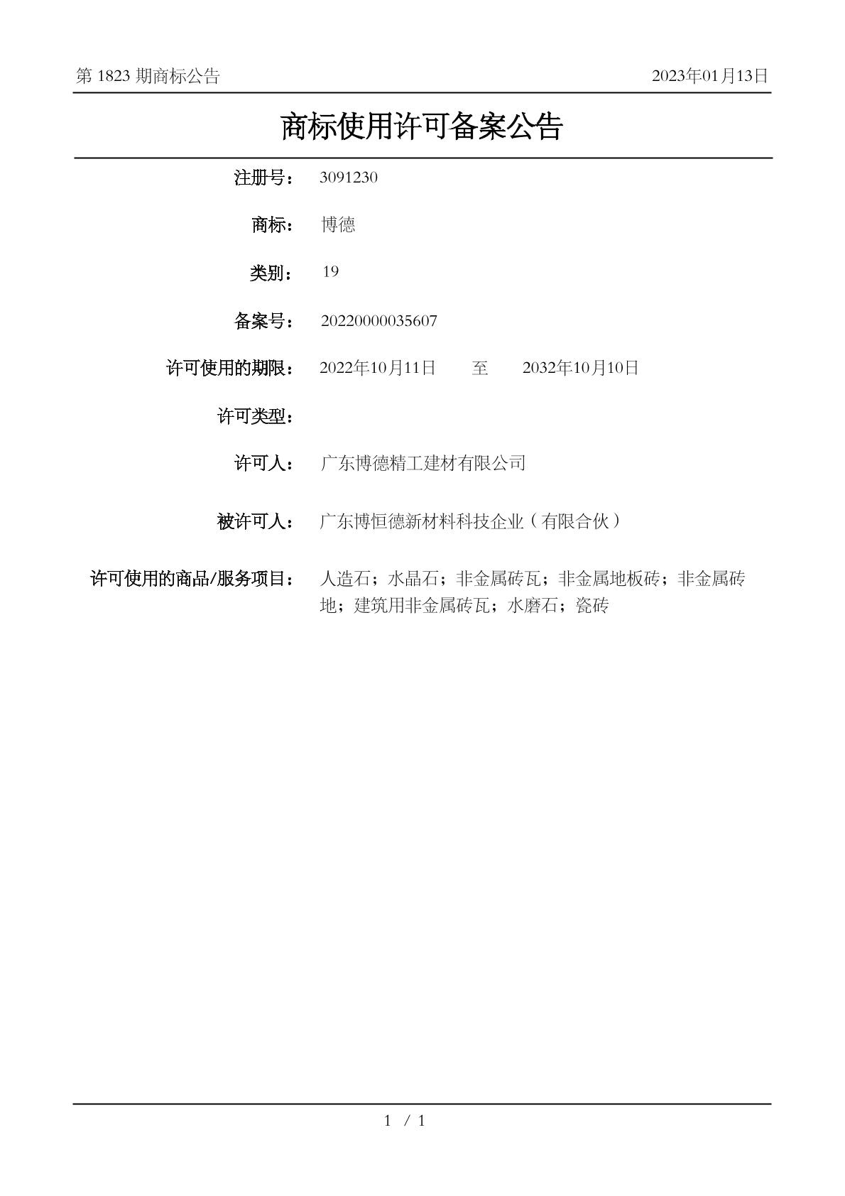 商标使用许 可备案公告 2023-01-13 第1823期 查看公告