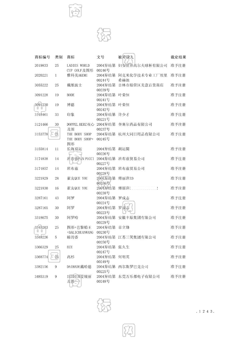 商标异议裁定公告 2004-12-28 第957期 查看公告