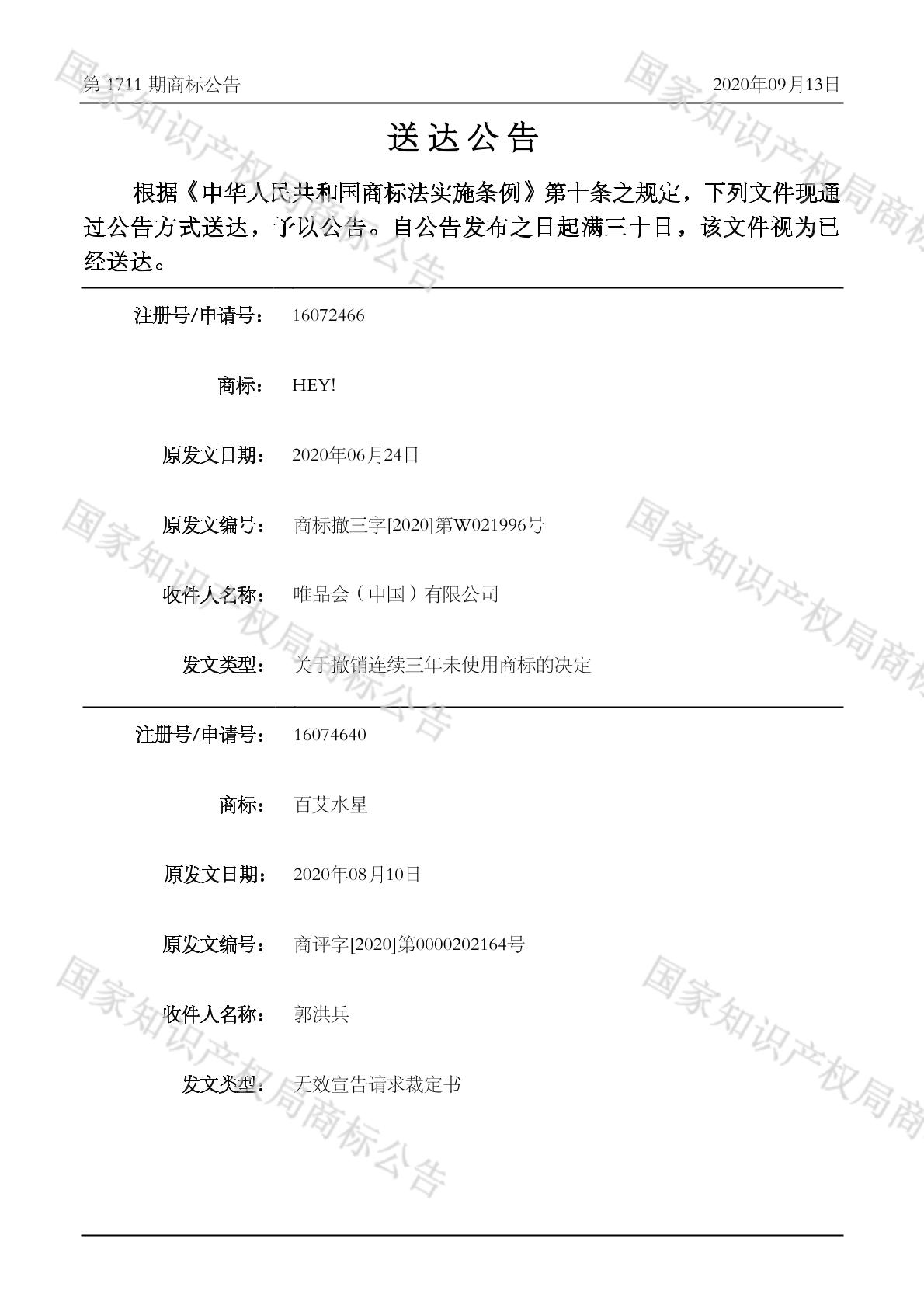 2020-09-14 撤销连续三年停止使用注册商标 | 排版送达公告