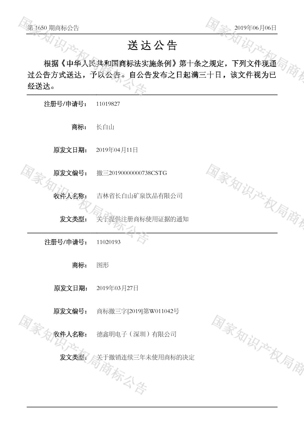 2019-04-25 撤销连续三年停止使用注册商标 | 提供证明通知发文