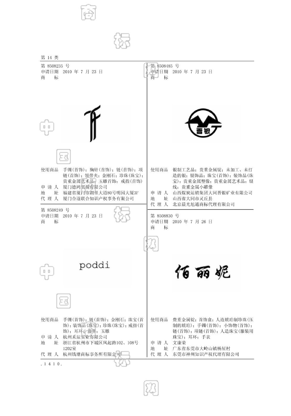 1401-贵重金属锭;1402-首饰盒;1403-人造珠宝(服装用珠宝);1403-人造琥珀制珍珠(压制的琥珀);1403-小饰物(首饰);1403-手镯(首饰);1403-耳环;1403-链(首饰);1403-项链(首饰);1404-手表 - 1262