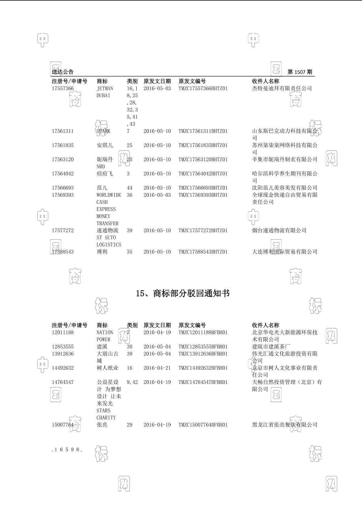 2016-06-15 商标注册申请 | 排版送达公告(商标部分驳回通知书)