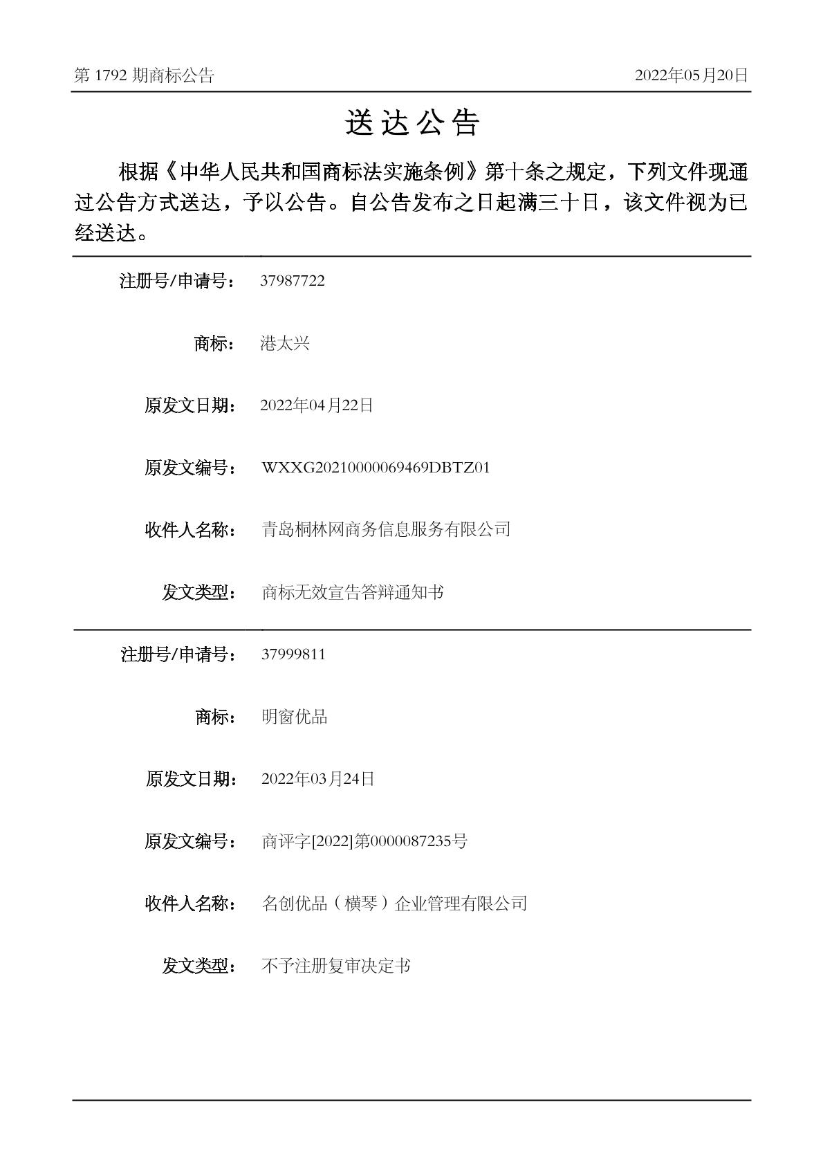 2022-05-21 不予注册复审 | 排版送达公告(不予注册复审决定书)