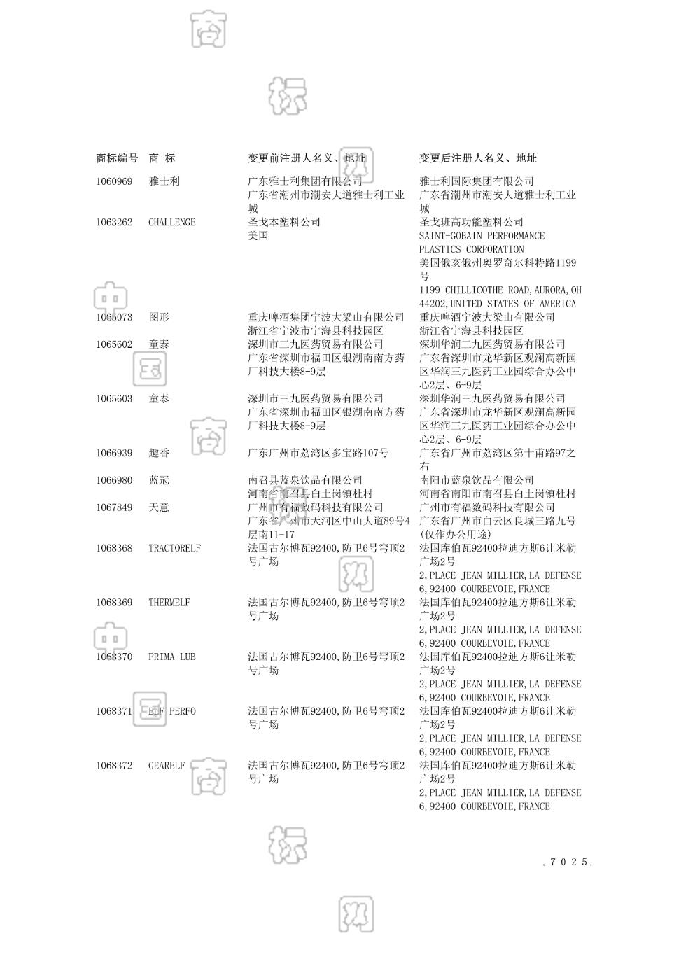 商标注册人/申请人名义及地址变更公告 2025-09-06 第1950期 查看公告