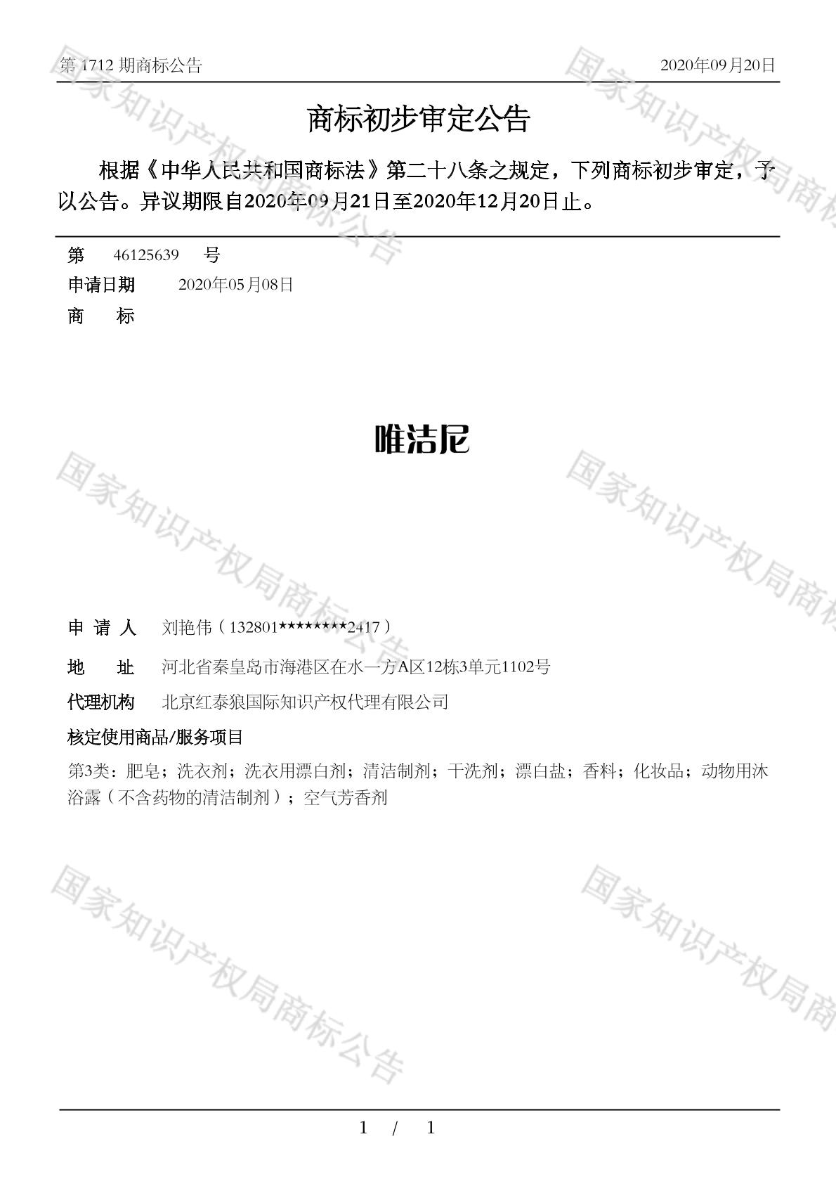 0301-干洗剂;0301-洗衣剂;0301-洗衣用漂白剂;0301-漂白盐;0301-肥皂;0302-清洁制剂;0305-香料;0306-化妆品;0309-动物用沐浴露(不含药物的清洁制剂);0310-空 气芳香剂 - 1712