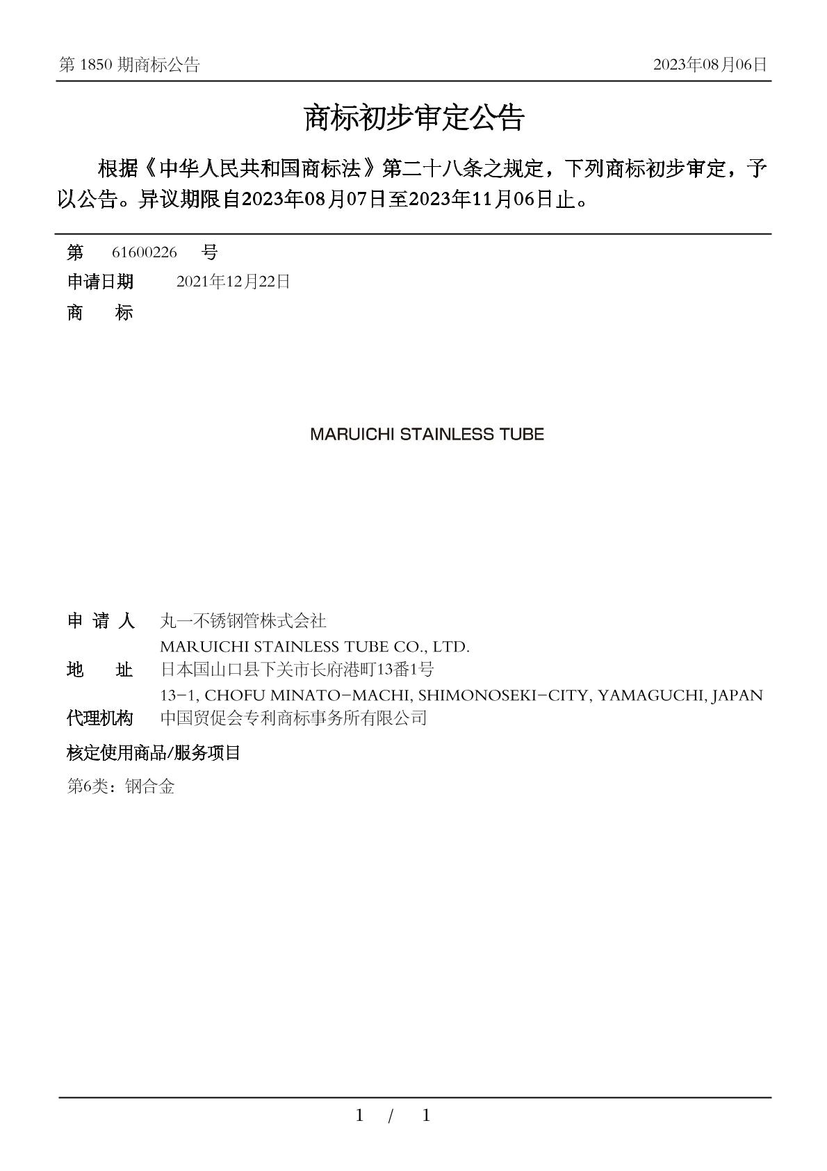 【MARUICHI STAINLESS TUBE】商标详情
