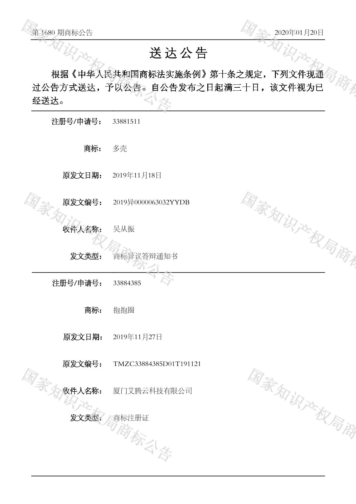 2020-01-20 商标异议申请 | 排版送达公告(商标异议答辩通知书)