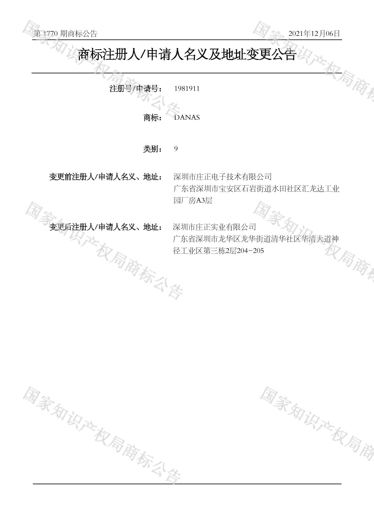 商标注册人/申请人名义及地址变更公告 2021-12-06 第1770期 查看公告