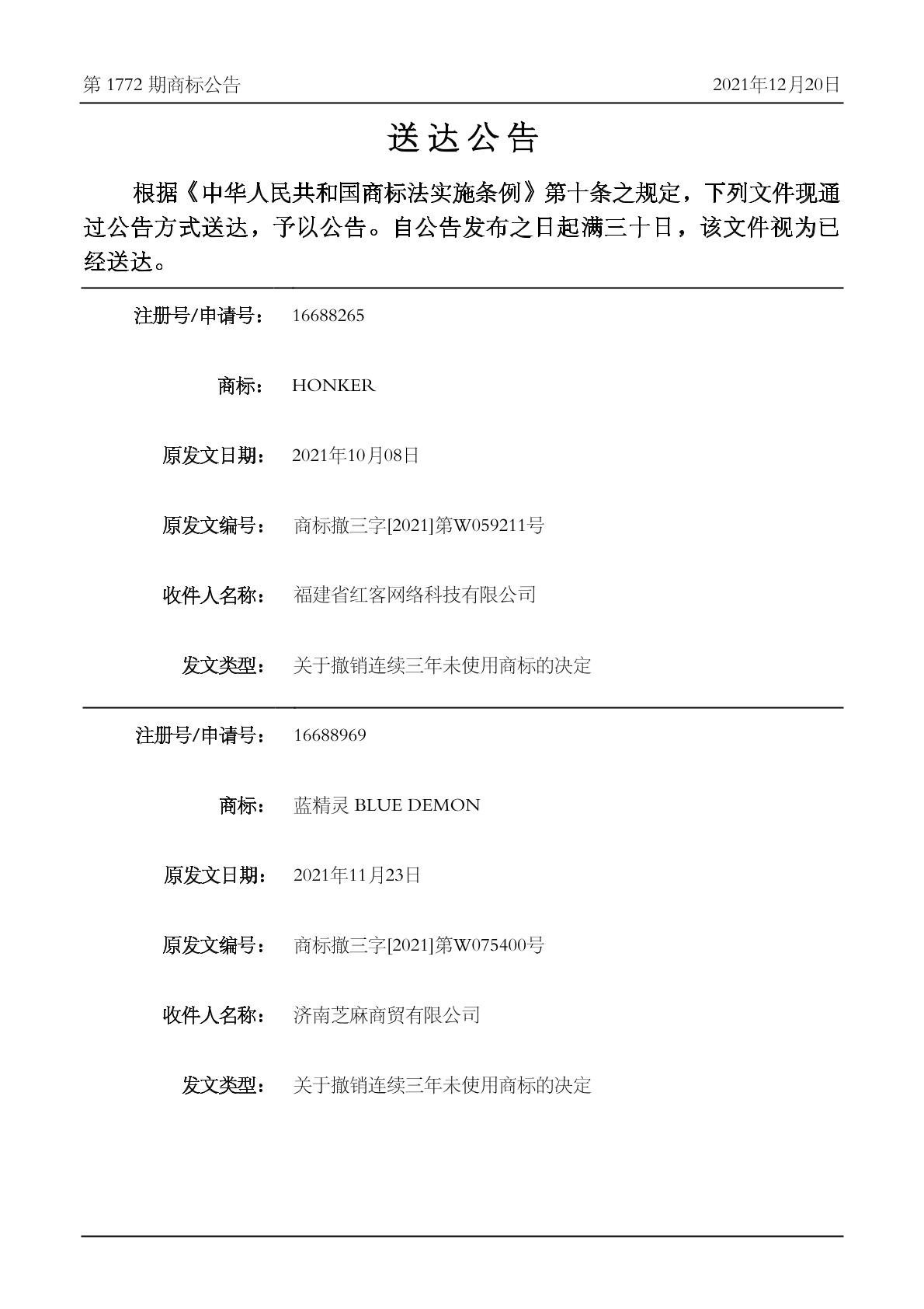 2021-12-21 撤销连续三年停止使用注册商标 | 排版送达公告(关于撤销连续三年未使用商标的决定)