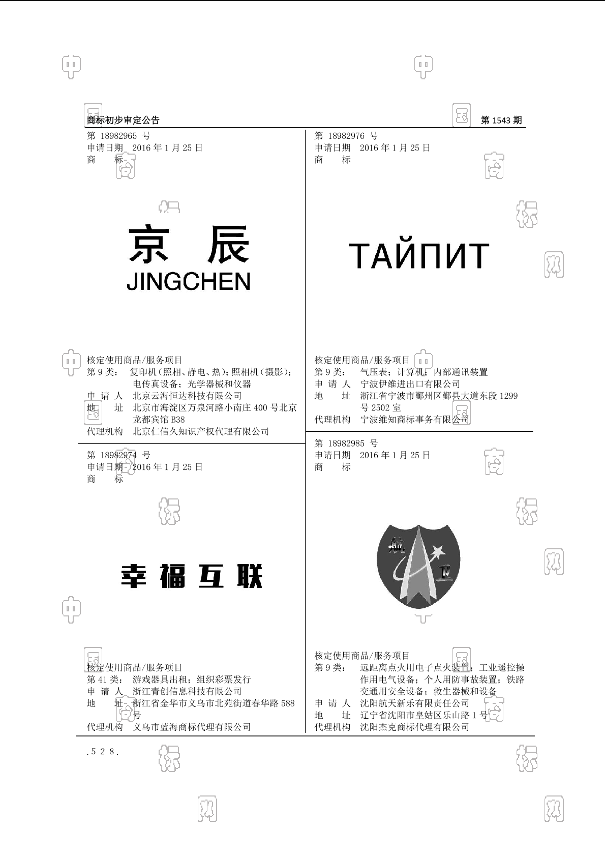 0906-机械式标志;0910-转速计;0913-电子芯片;0913-芯片(集成电路);0913-集成电路;0914-工业遥控操作用电气设备;0914-远距离点火用电子点火装置;0919-个人用防事故装置;0919-救生器械和设备;0919-铁路交通用安全设备 - 1543