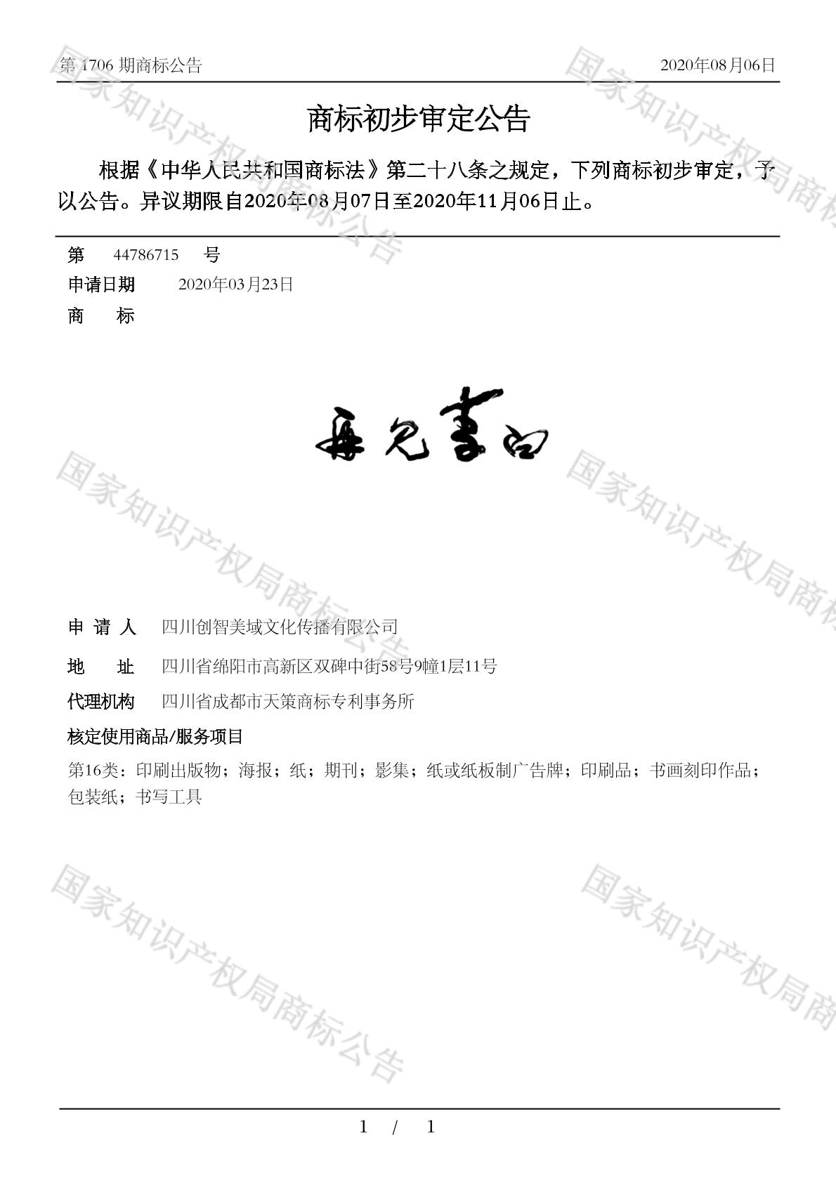 1601-纸;1604-纸或纸板制广告牌;1605-印刷品;1605-影集;1606-印刷出版物;1606-期刊;1606-海报;1607-书画刻印作品;1609-包装纸;1614-书写工具 - 1706
