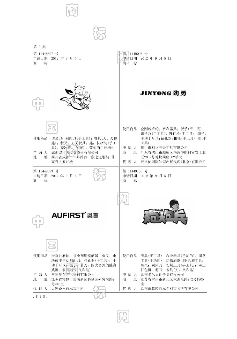 0801-磨具(手工具);0802-农业器具(手动的);0803-园艺工具(手动的);0804-动物剥皮用器具和工具;0805-鱼叉;0806-剃须刀;0807-切割工具(手工具);0808-手工打包机;0810-剪刀;0812-餐具(刀、叉和匙) - 1382