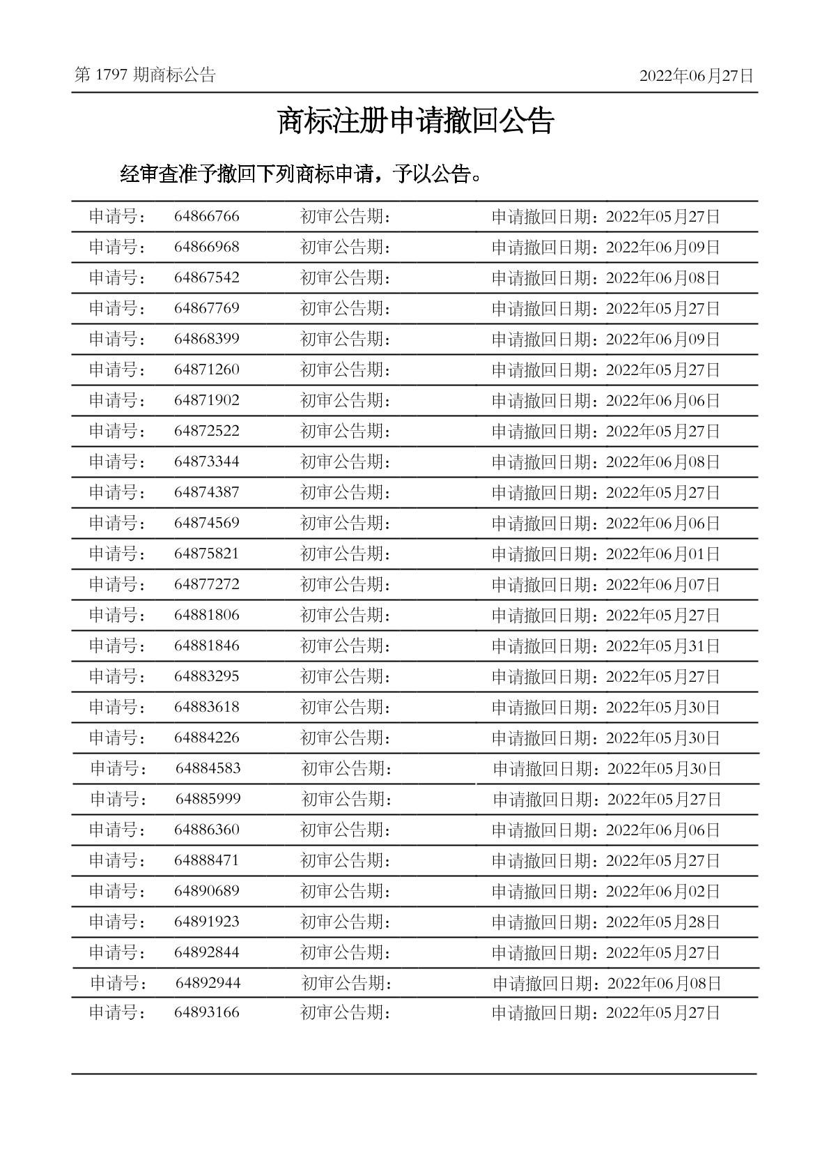 商标注册申请撤回公告 2022-06-27 第1797期 查看公告
