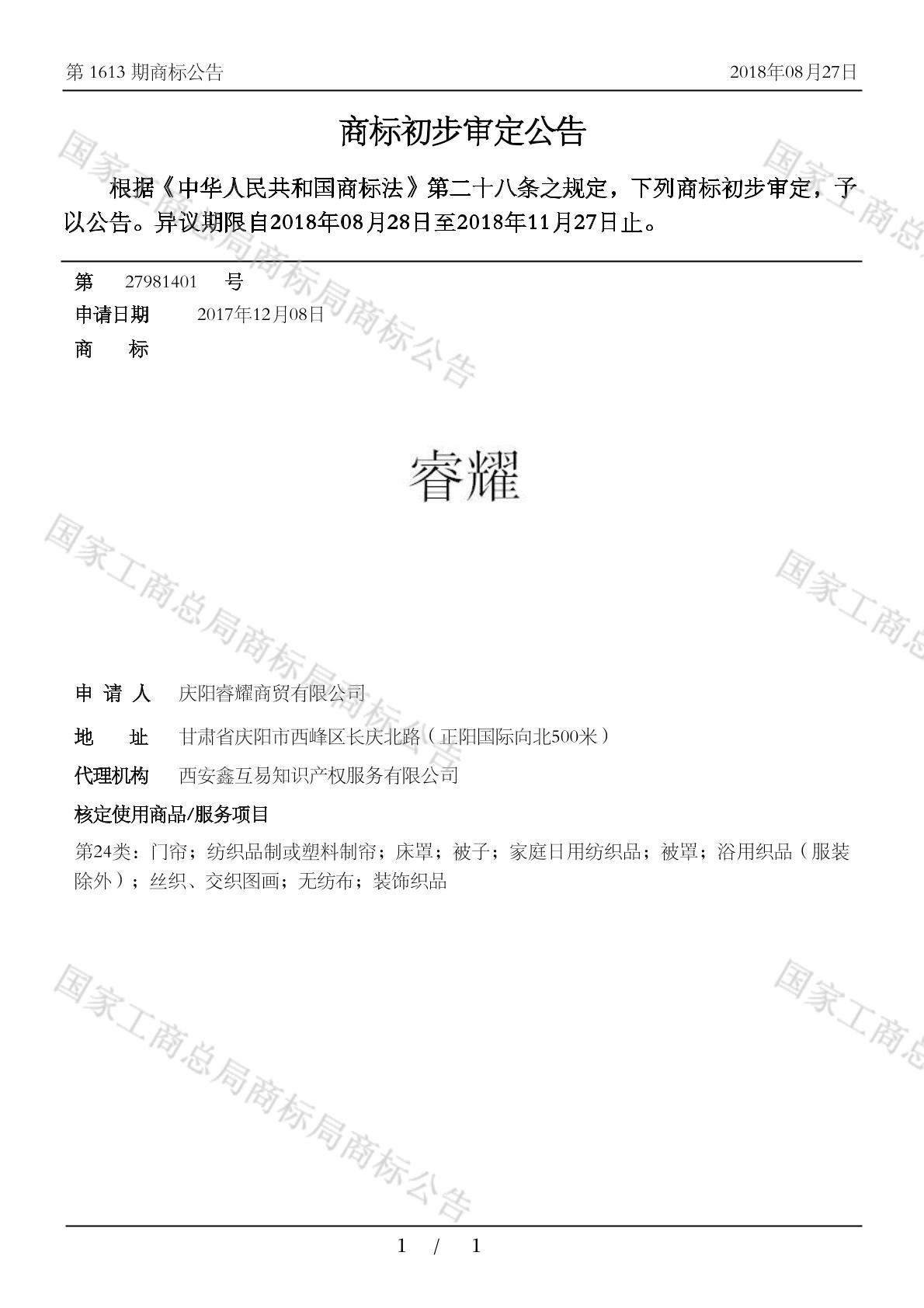 2401-装饰织品;2402-无纺布;2403-丝织、交织图画;2405-家庭日用纺织品;2405-浴用织品(服装除外);2406-家庭日用纺织品;2406-床罩;2406-被子;2406-被罩;2407-家庭日用纺织品;2407-纺织品制或塑料制帘;2407-门帘 - 1613