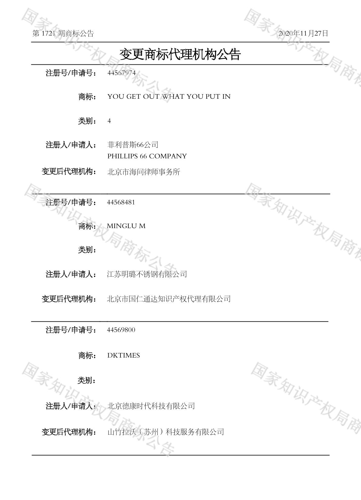 变更商标代理机构公告 2020-11-27 第1721期 查看公告