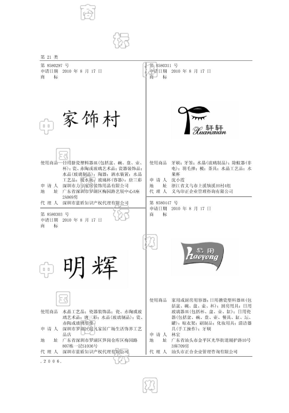 2101-水果杯;2104-水晶工艺品;2105-茶具;2107-梳;2108-牙刷;2109-牙签;2110-装有化妆用品的盒;2112-羽毛掸;2113-水晶(玻璃制品);2115-除蚊器(非电) - 1265
