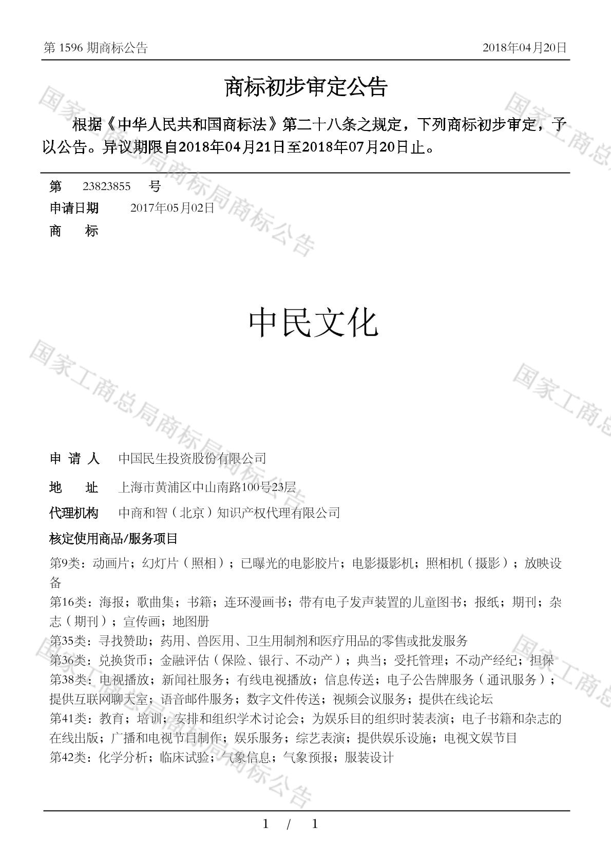4505-交友服务;4505-在线社交网络服务;4505-婚姻介绍;4506-法律文件准备服务;4506-法律研究;4506-版权管理;4506-知识产权咨询;4506-知识产权许可;4506-计算机软件许可(法律服务);4506-诉讼服务 - 中国民生投资股份有限公司