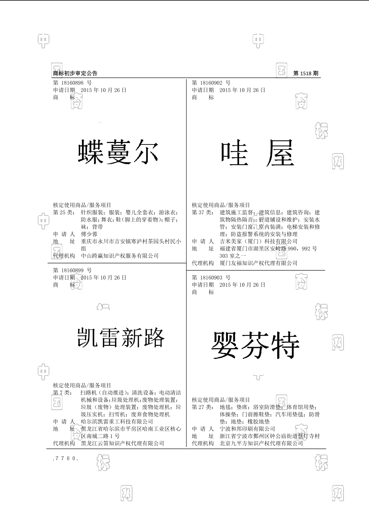 3701-建筑信息;3701-建筑咨询;3701-建筑施工监督;3702-安装水管;3702-安装门窗;3702-建筑物隔热隔音;3702-管道铺设和维护;3704-室内装潢;3718-电梯安装和修理;3718-防盗报警系统的安装与修理 - 1518