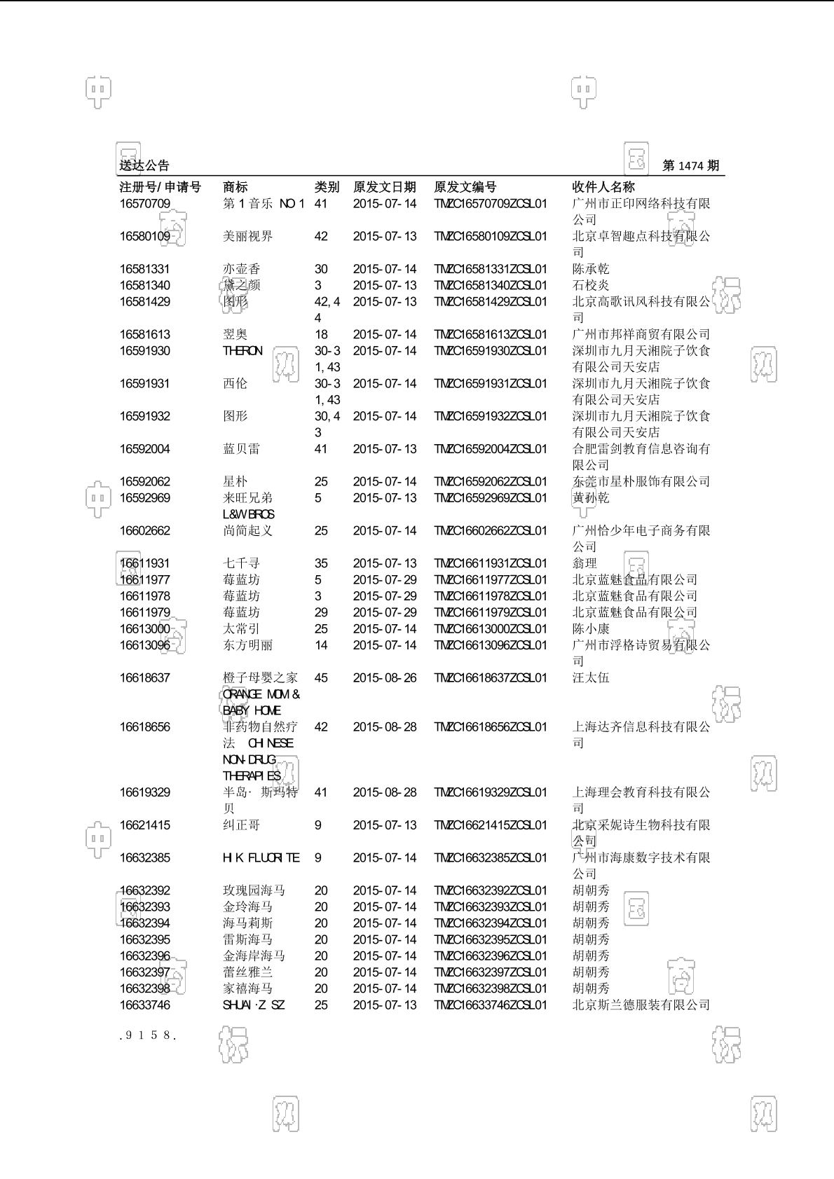 2015-10-08 商标注册申请 | 排版送达公告(商标注册申请受理通知书)