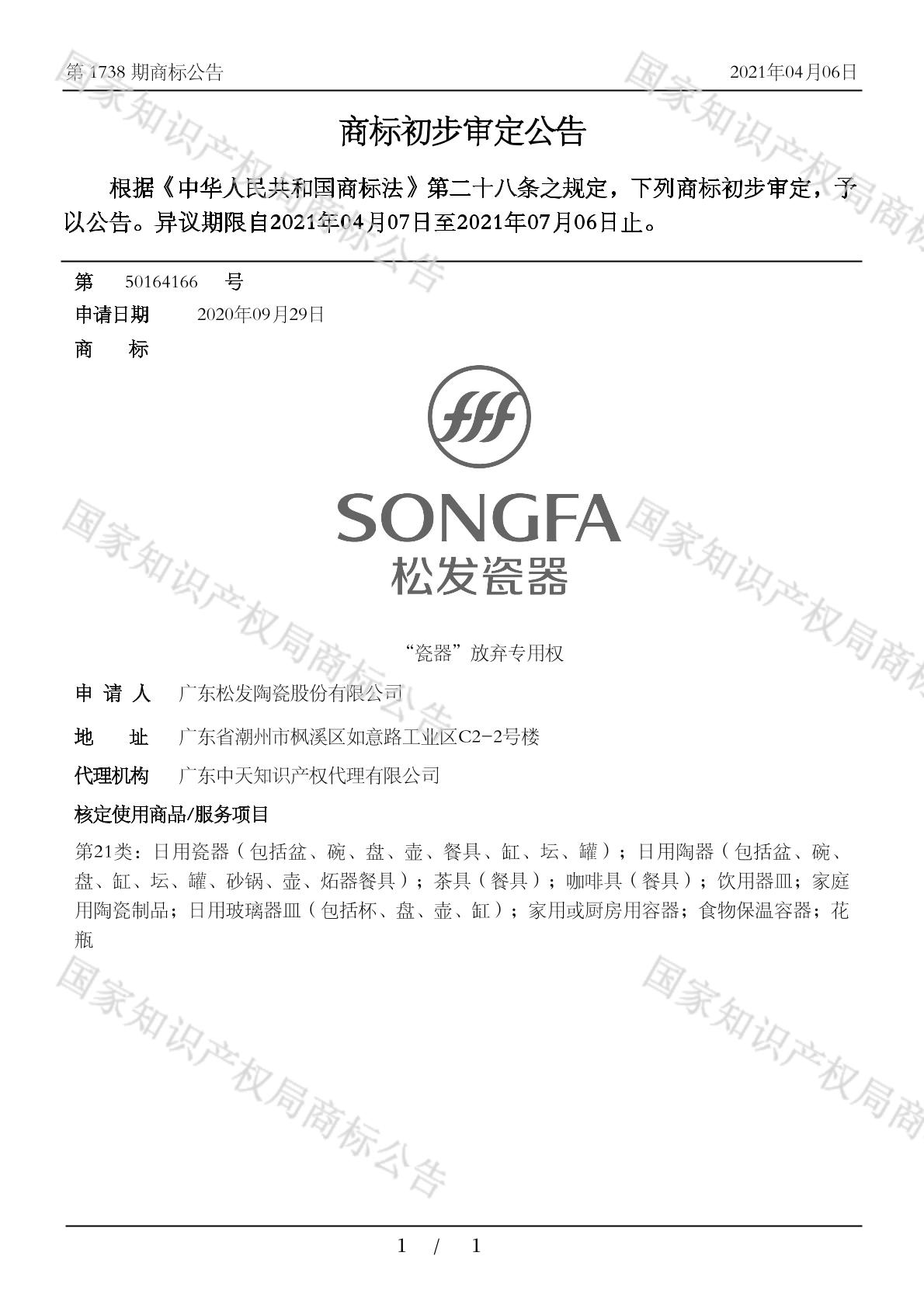 【松发瓷器 SONGFA】商标详情