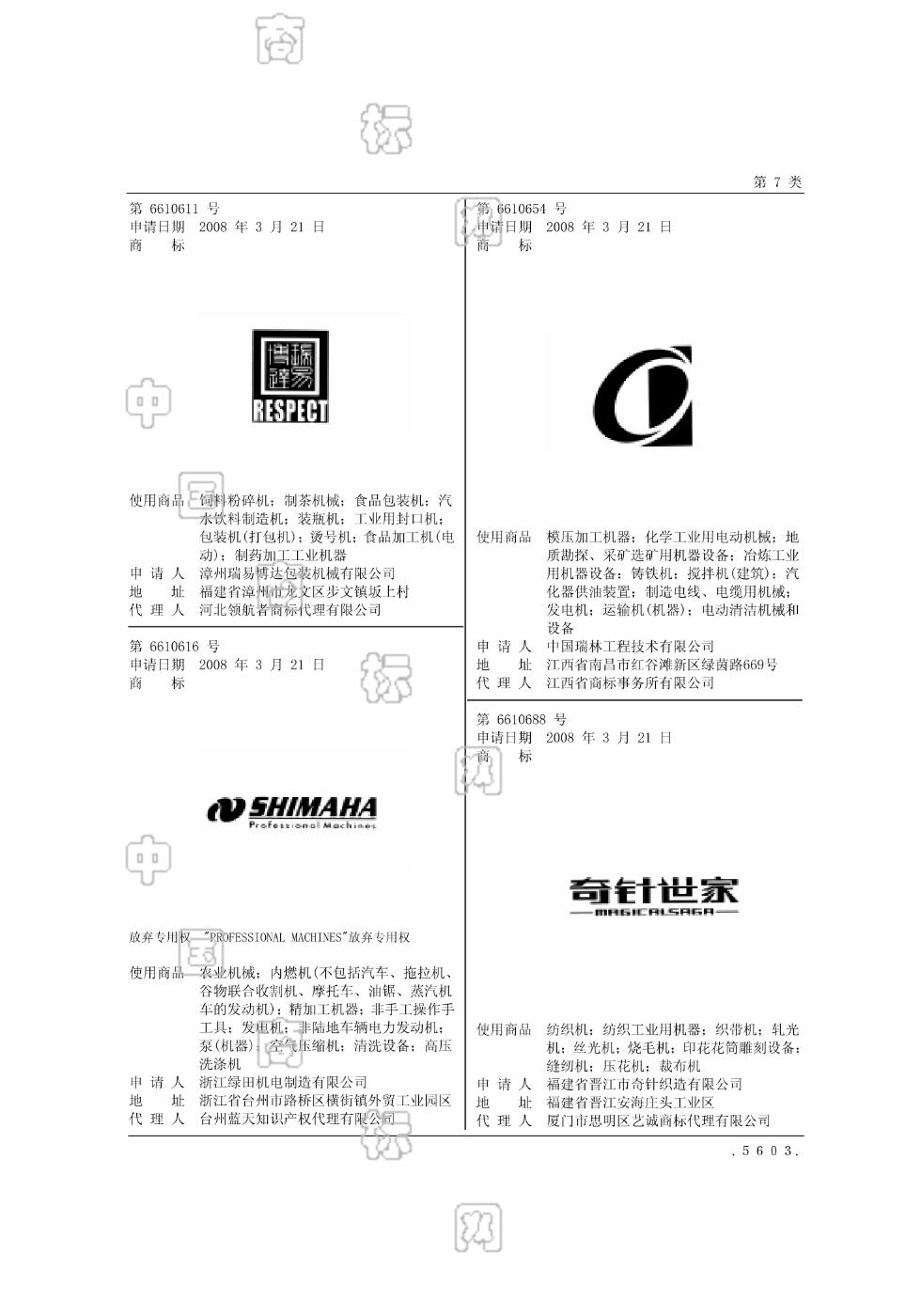 0702-饲料粉碎机;0708-制茶机械;0709-食品包装机;0710-汽水饮料制造机;0721-包装机(打包机);0721-工业用封口机;0721-烫号机;0721-装瓶机;0723-食品加工机(电动);0725-制药加工工业机器 - 1197