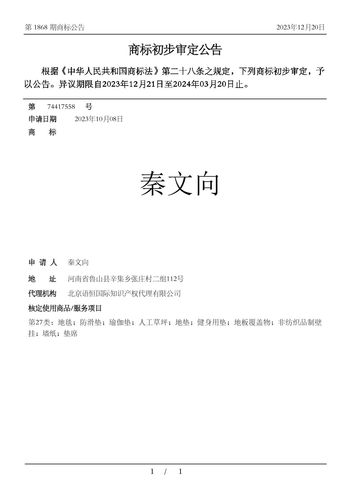 2701-地毯;2702-垫席;2703-人工草坪;2703-健身用垫;2703-地垫;2703-地板覆盖物;2703-瑜伽垫;2703-防滑垫;2704-墙纸;2704-非纺织品制壁挂 - 1868