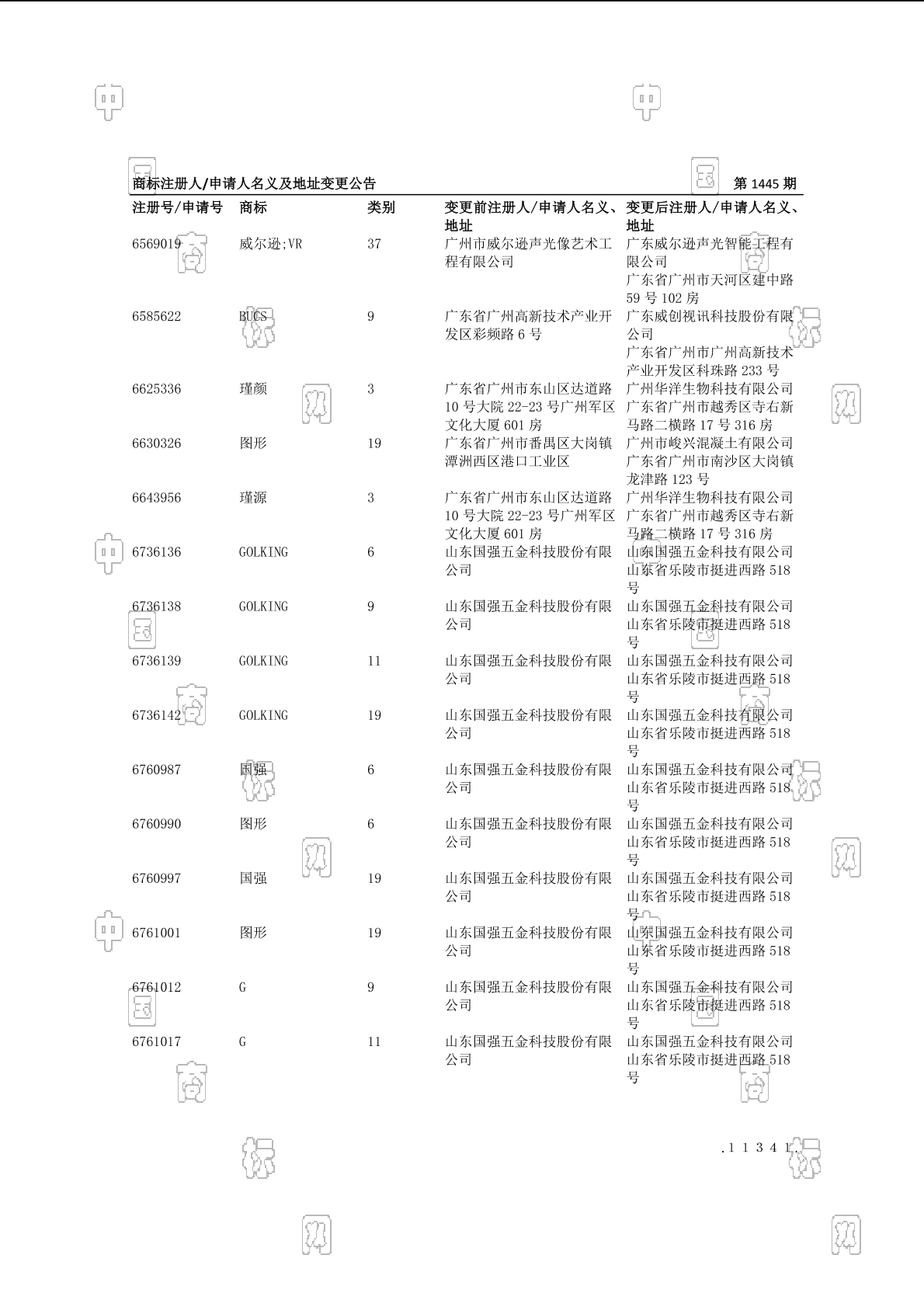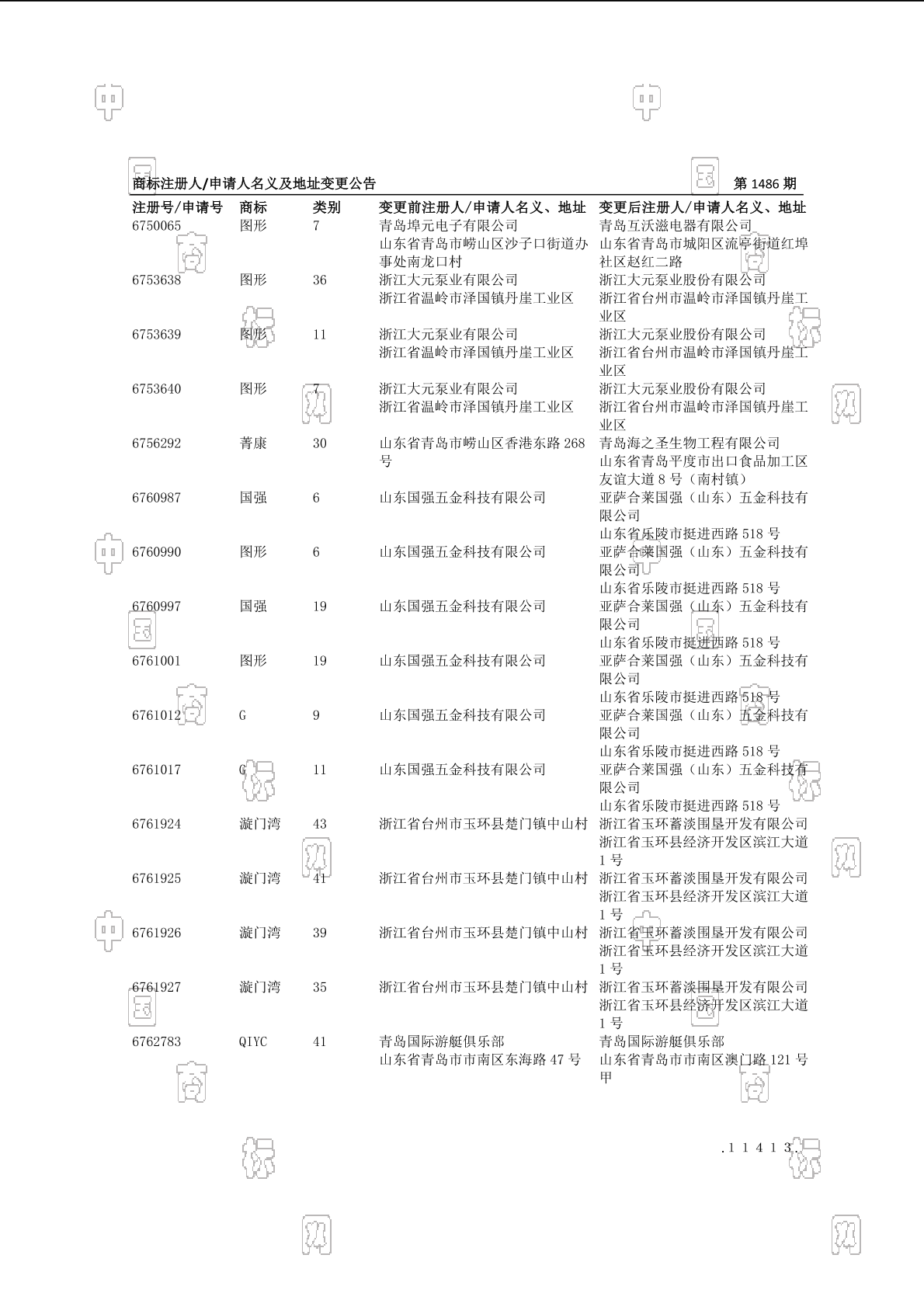 商标注册人申请人名义及地址变更公告 2016-01-06 第1486期 查看公告