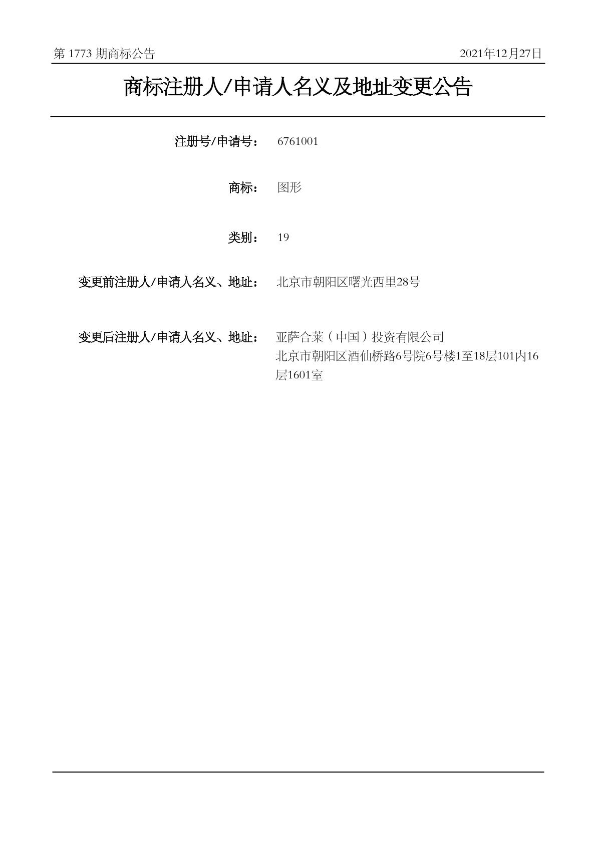 商标注册人/申请人名义及地址变更公告 2021-12-27 第1773期 查看公告