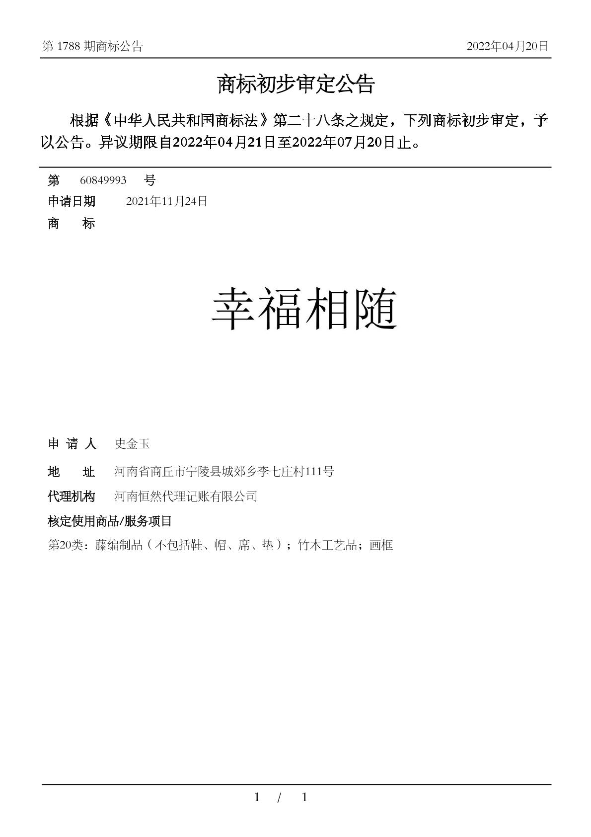 2001-家具;2001-床;2001-床垫;2001-沙发;2001-浴室柜(家具);2004- 画框;2005-竹木工艺品;2005-藤编制品(不包括鞋、帽、席、垫);2013-垫枕;2013-枕头 - 1788