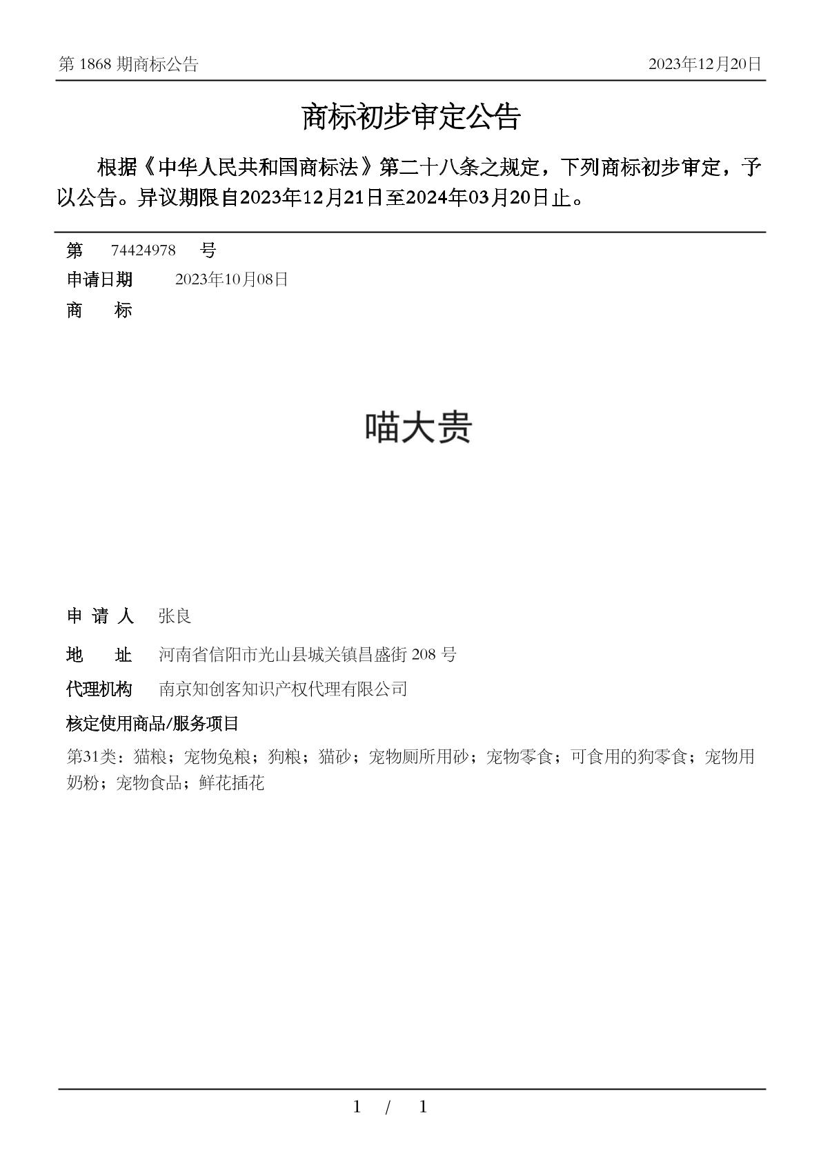 3103-鲜花插花;3108-可食用的狗零食;3108-宠物兔粮;3108-宠物用奶粉;3108-宠物零食;3108-宠物食品;3108-狗粮;3108-猫粮;3110-宠物厕所用砂;3110-猫砂 - 1868