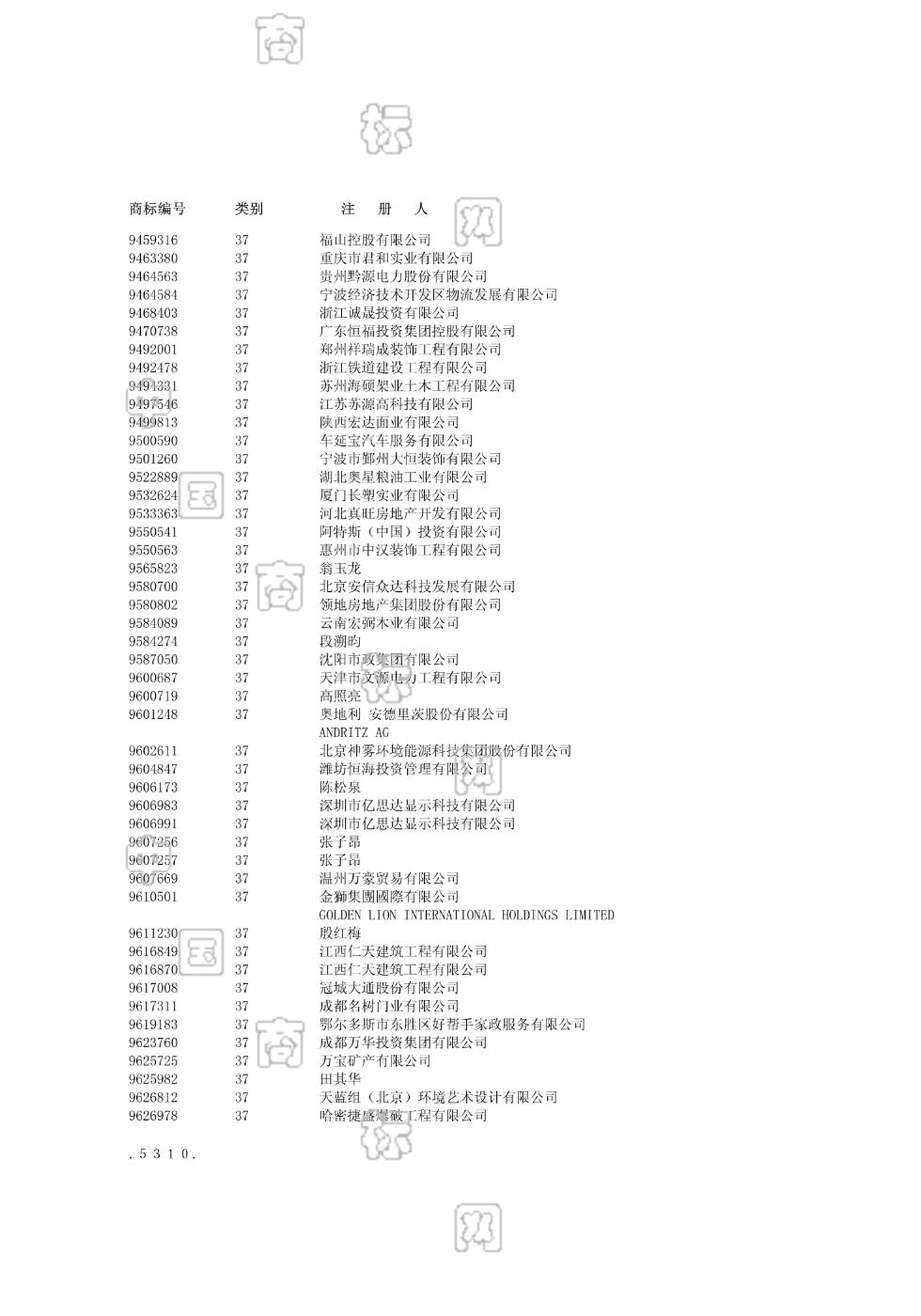 3701-建筑施工监督;3702-建筑;3703-采矿;3704-室内装璜;3705-供暖设备的安装和修理;3706-机械安装、保养和修理;3706-电器设备的安装与修理;3706-空调设备的安装与修理;3706-计算机硬件安装、维护和修理;3707-车辆保养和修理;3711-钟表修理;3716-干洗;3718-电梯安装和修理 - 1313