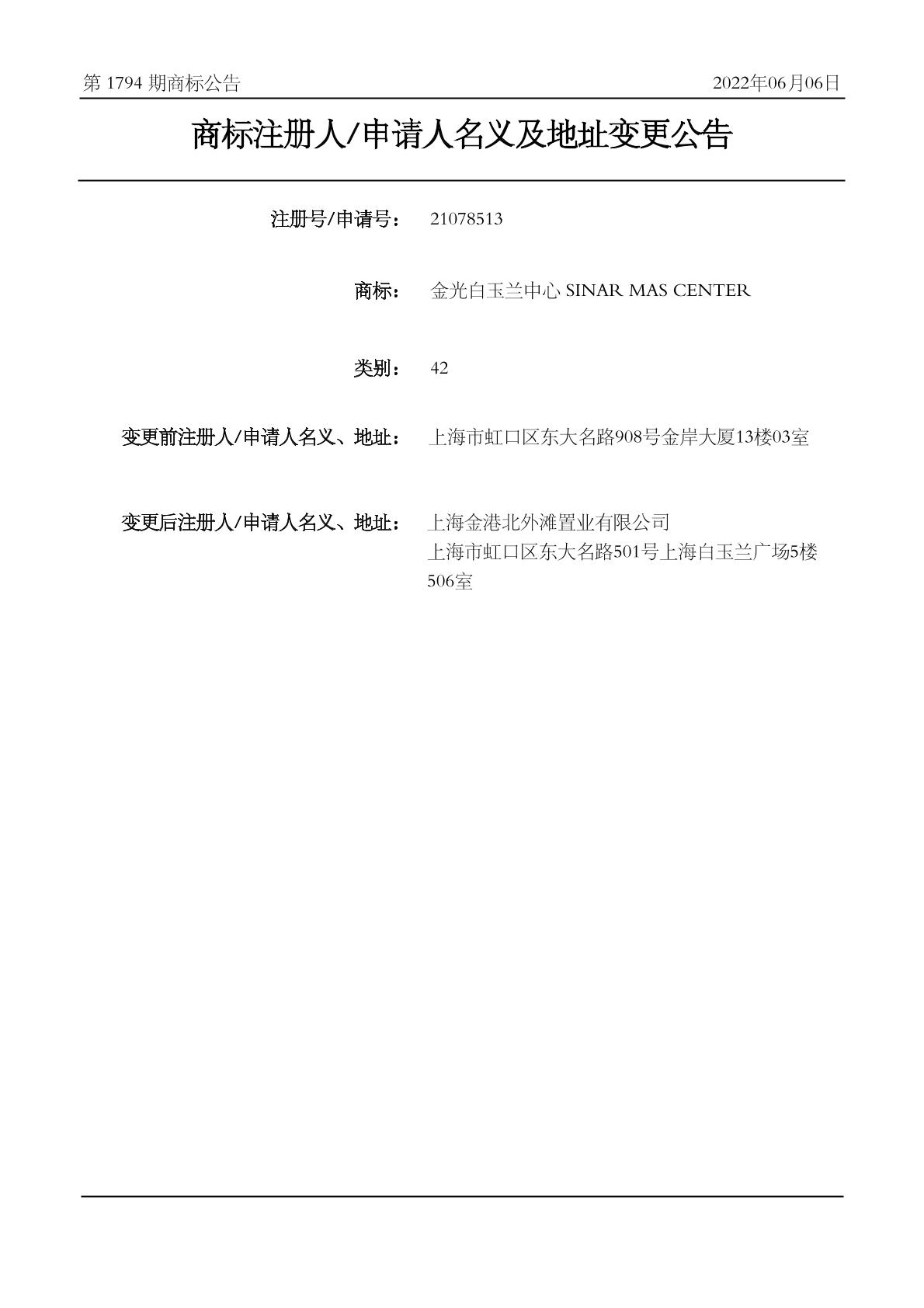 【金光白玉兰中心 SINAR MAS CENTER】商标详情
