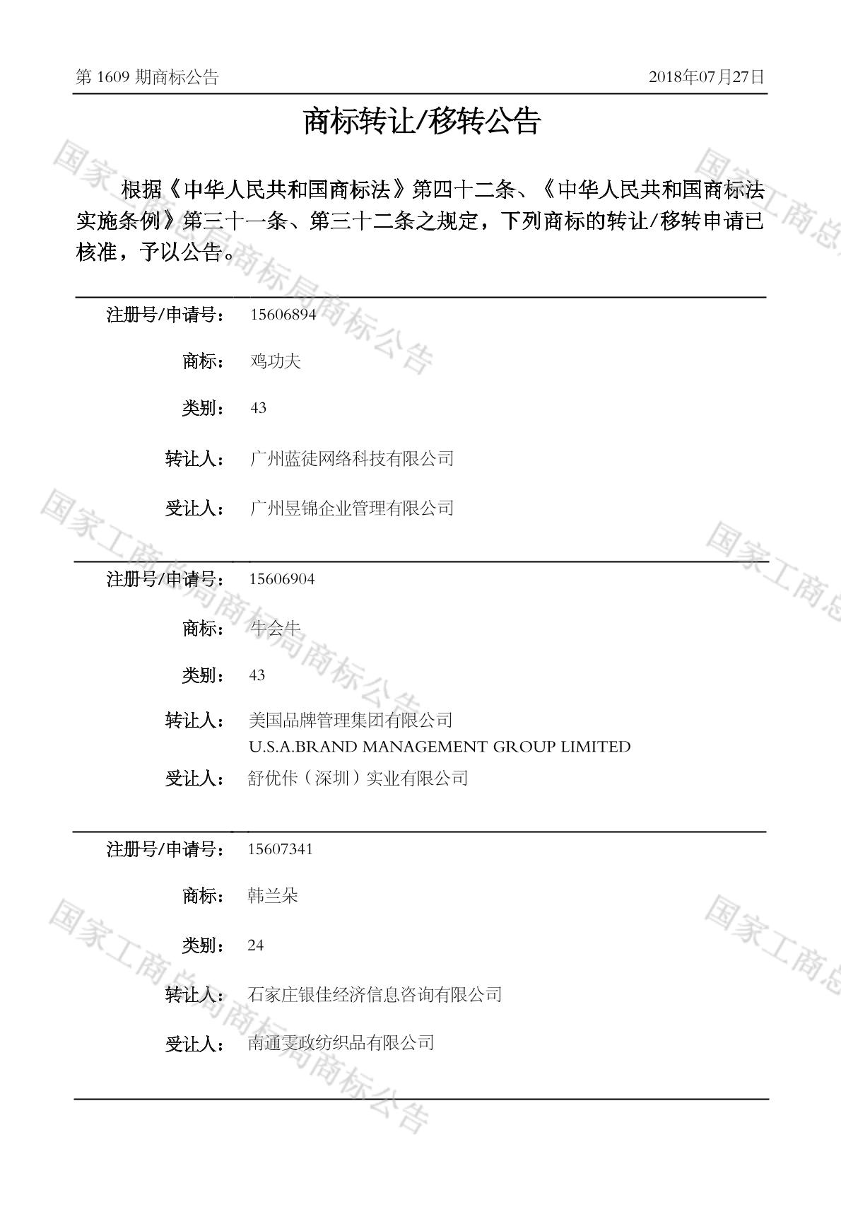 商标转让移转公告 2018-07-27 第1609期 查看公告
