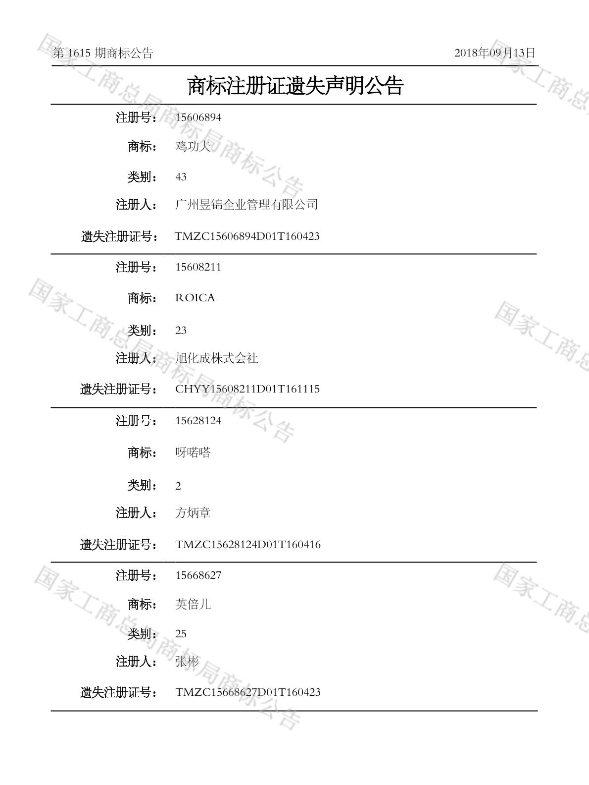 商标注册证遗失声明公告 2018-09-13 第1615期 查看公告