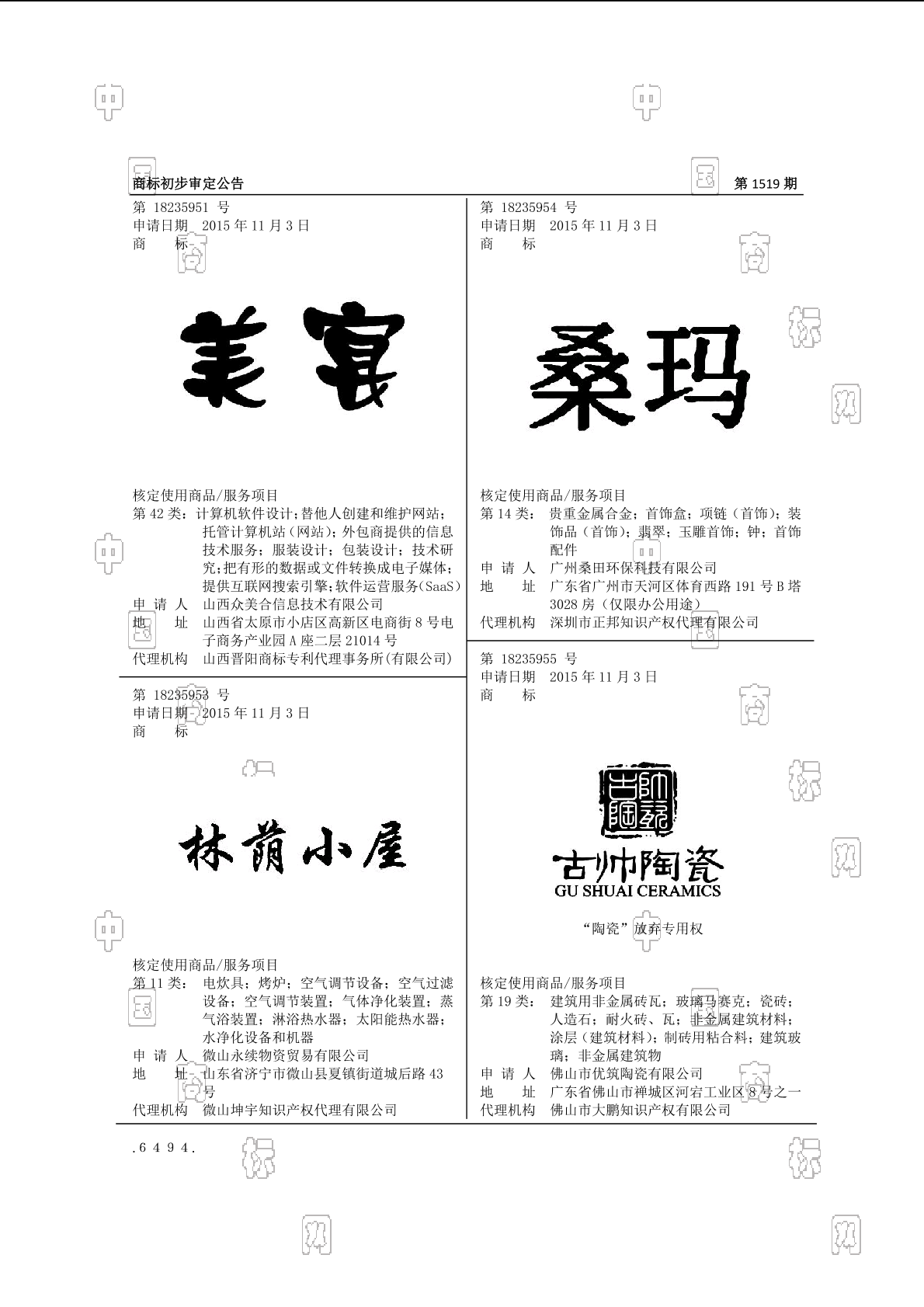 1902-人造石;1906-建筑用非金属砖瓦;1906-玻璃马赛克;1906-瓷砖;1907-耐火砖、瓦;1909-非金属建筑材料;1910-非金属建筑物;1911-建筑玻璃;1912-涂层(建筑材料);1913-制砖用粘合料 - 1519