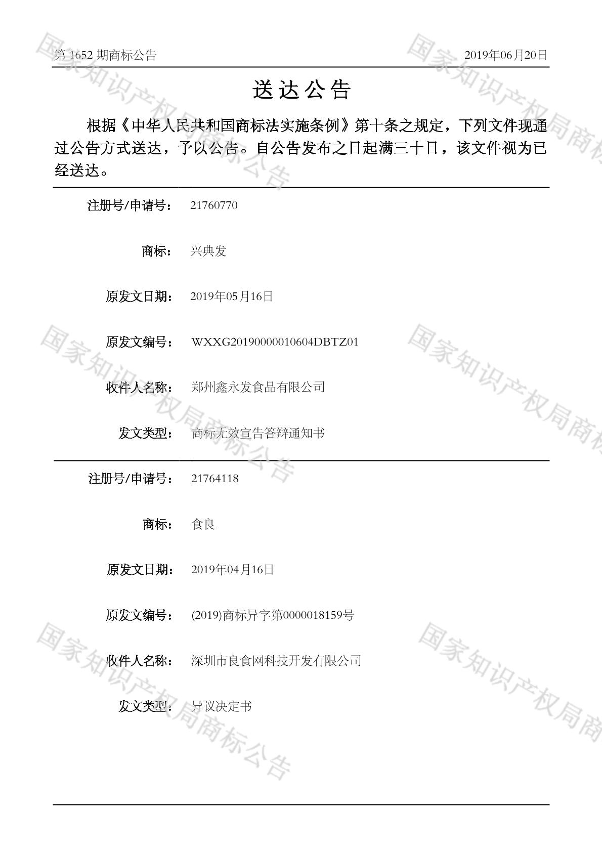 2019-06-20 商标异议申请 | 排版送达公告(异议决定书)