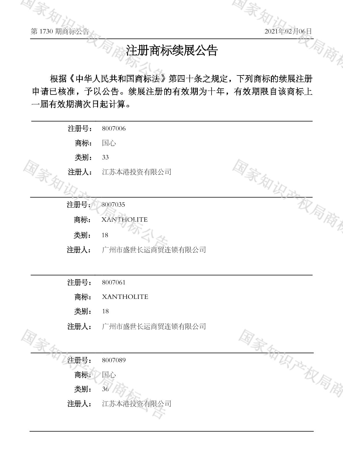 注册商标续展公告 2021-02-06 第1730期 查看公告