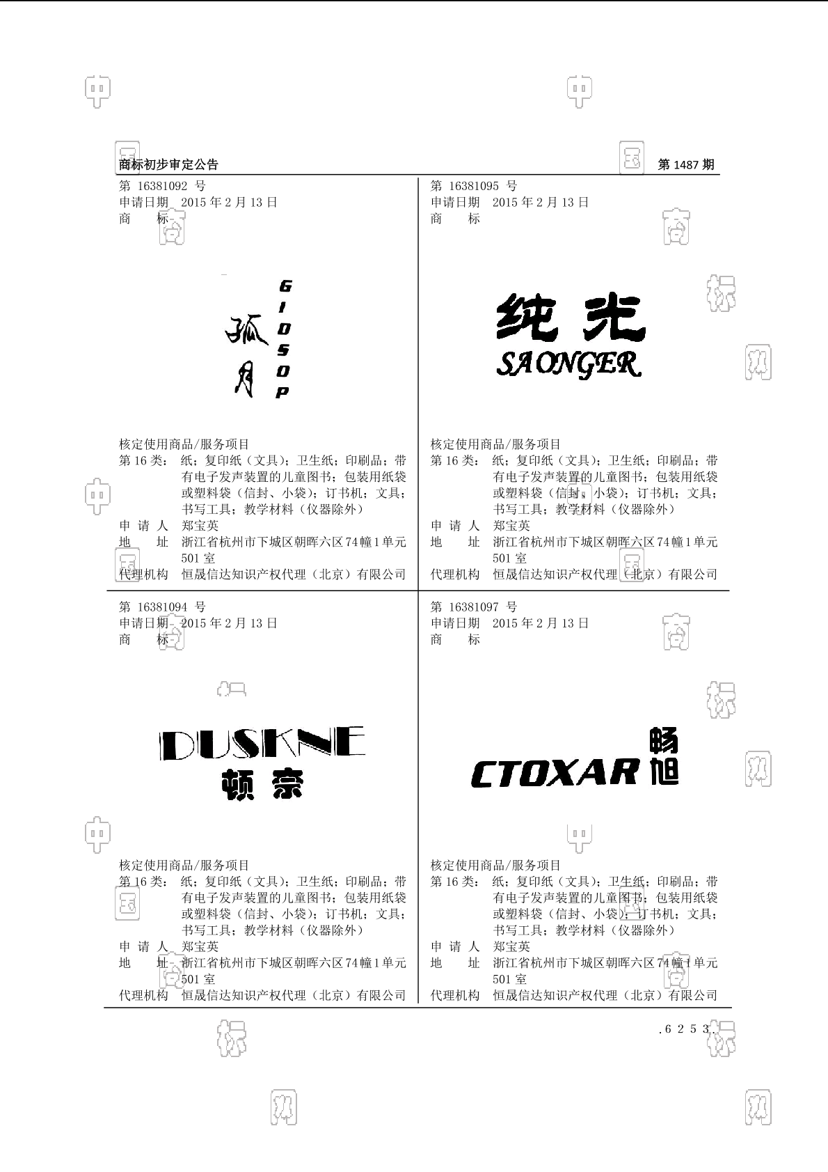 1601-纸;1602-复印纸(文具);1603-卫生纸;1605-印刷品;1606-带有电子发声装置的儿童图书;1609-包装用纸袋或塑料袋(信封、小袋);1610-订书机;1611-文具;1614-书写工具;1619-教学材料(仪器除外) - 1487