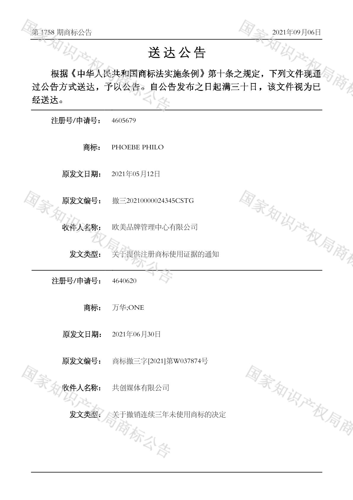 2021-09-06 撤销连续三年停止使用注册商标 | 排版送达公告(无退信)
