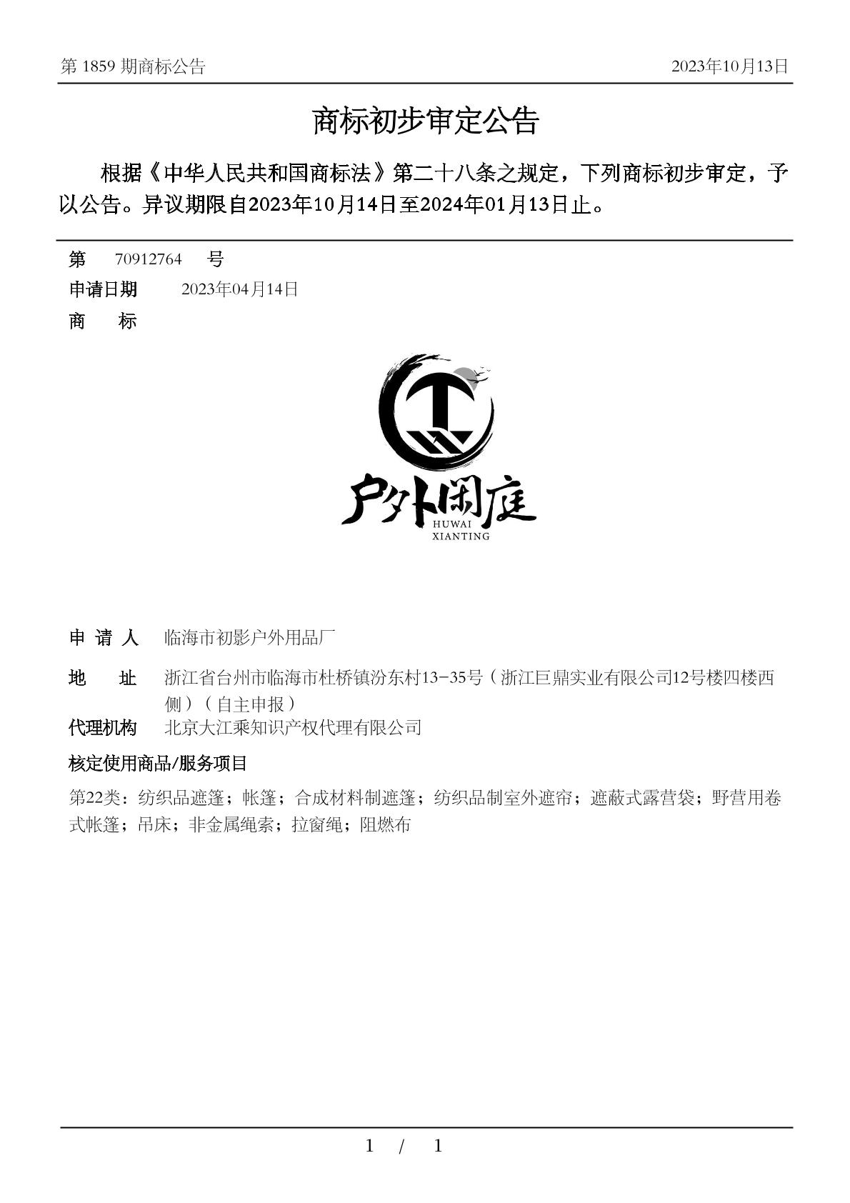 2201-拉窗绳;2201-非金属绳索;2202-合成材料制遮篷;2202-吊床;2202-帐篷;2202-纺织品制室外遮帘;2202-纺织品遮篷;2202-遮蔽式露营袋;2202-野营用卷式帐篷;2202-阻燃布 - 1859