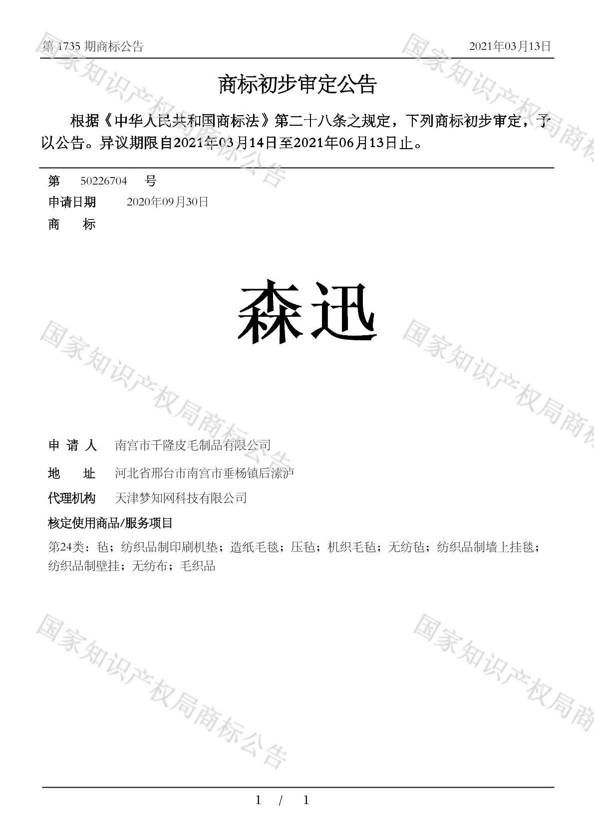 2401-毛织品;2402-无纺布;2403-纺织品制墙上挂毯;2403-纺织品制壁挂;2404-压毡;2404-无纺毡;2404-机织毛毡;2404-毡;2404-纺织品制印刷机垫;2404-造纸毛毯 - 1735