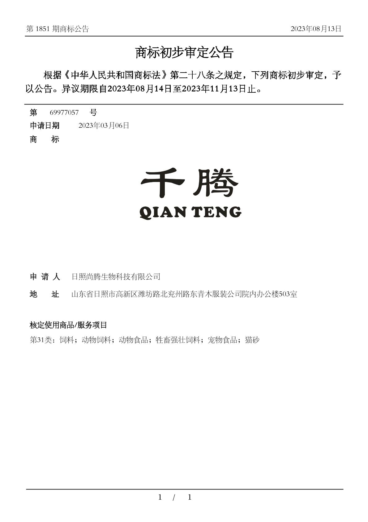 3101-植物;3101-活树木;3103-植物;3108-动物食品;3108-动物饲料;3108-宠物食品;3108-牲畜强壮饲料;3108-饲料;3110-猫砂 - 1851